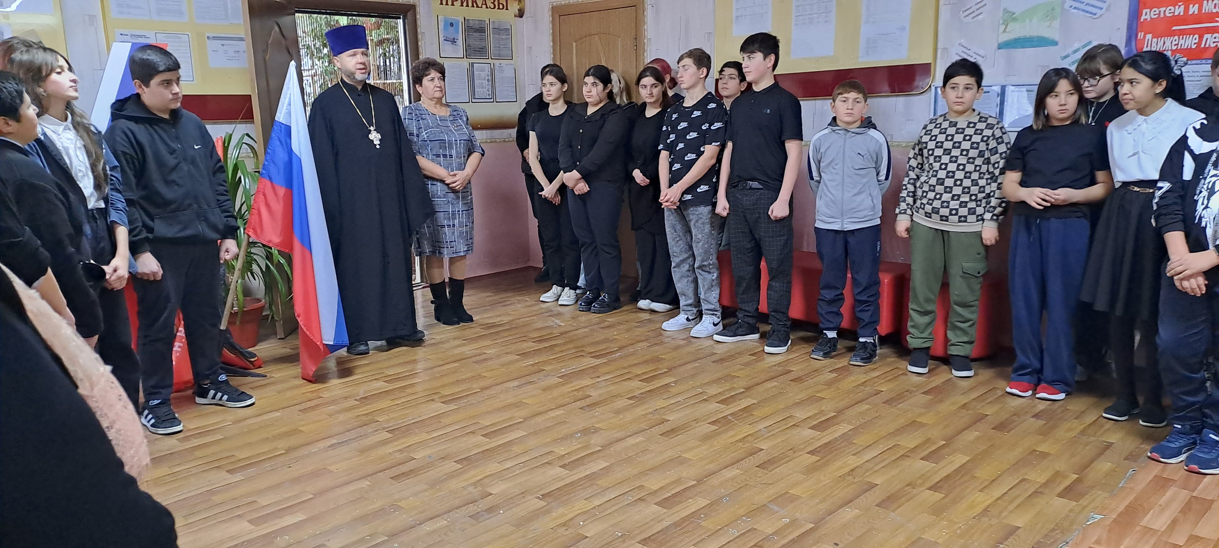 Священник, в своем обращении к учителям и учащимся, напомнил основные героические страницы истории России и отметил роль духовного подвига защитников Отечества, а также призвал изучать героическое прошлое страны и сохранять память о воинах, павших в боях.
