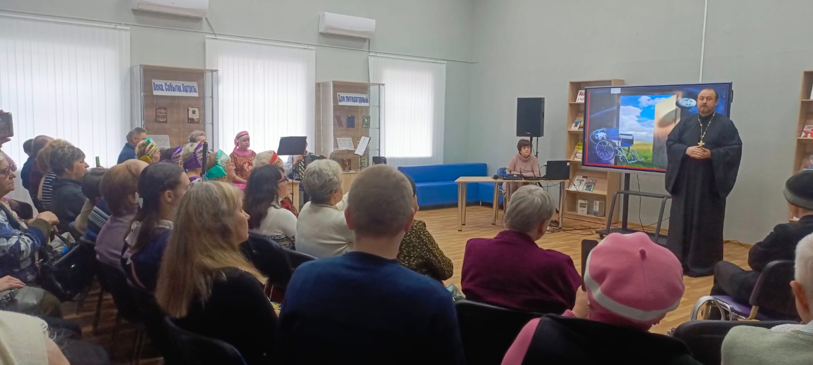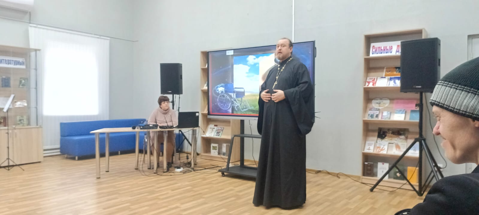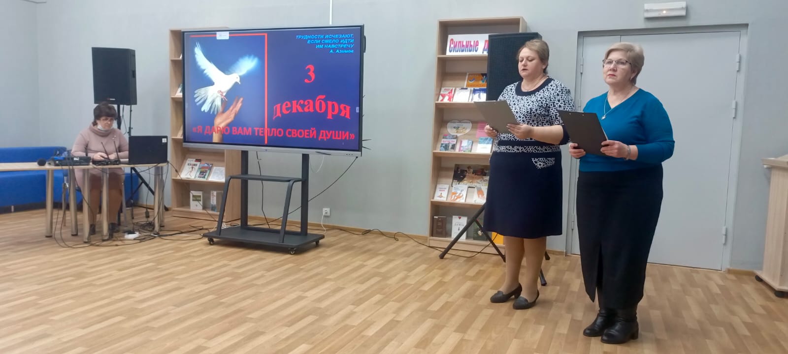 В рамках Международного дня инвалидов центральная городская модельная библиотека им. А. М. Горького провела литературно- музыкальную композицию «Я вам дарю тепло своей души», направленную на привлечение внимания к людям с ограниченными возможностями здоровья.На мероприятие были приглашены члены городского общества инвалидов, общества слепых, читатели. Слово для поздравления было предоставлено протоиерею Роману Амплееву, настоятелю храма Донской иконы Божией Матери, благочинному Новошахтинского округа, и его помощнице, Саханиной И.В.