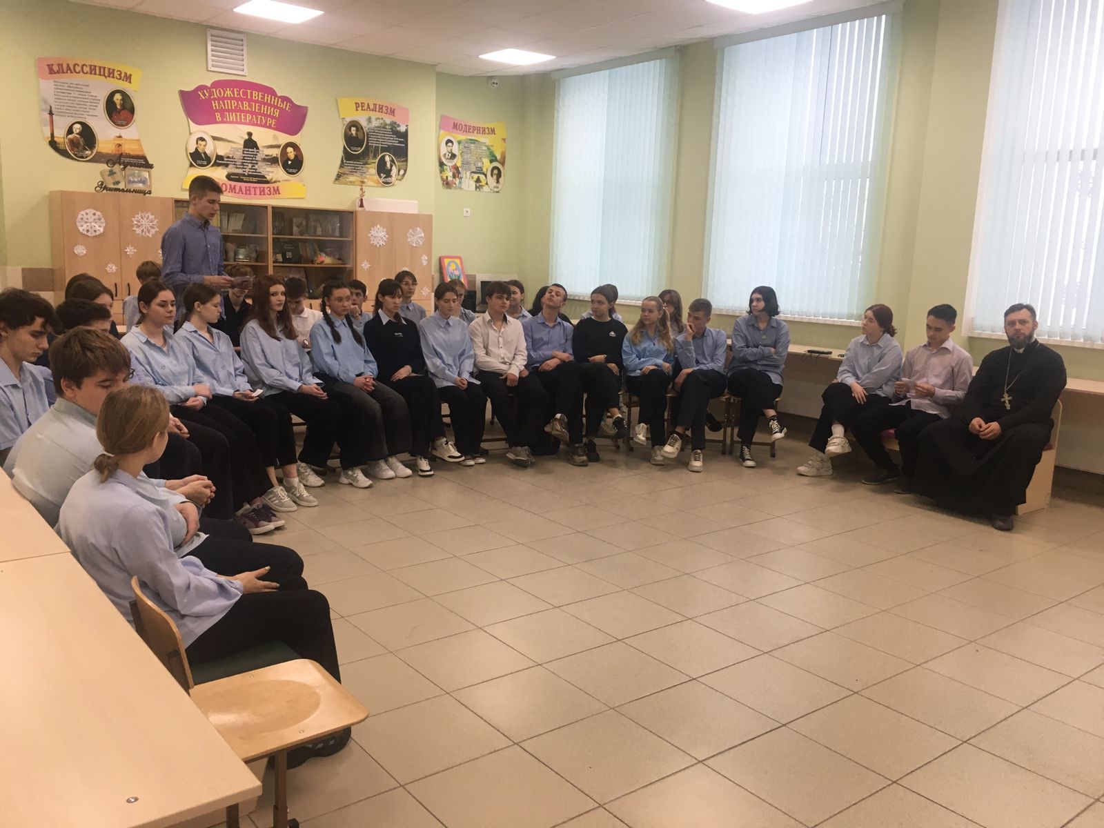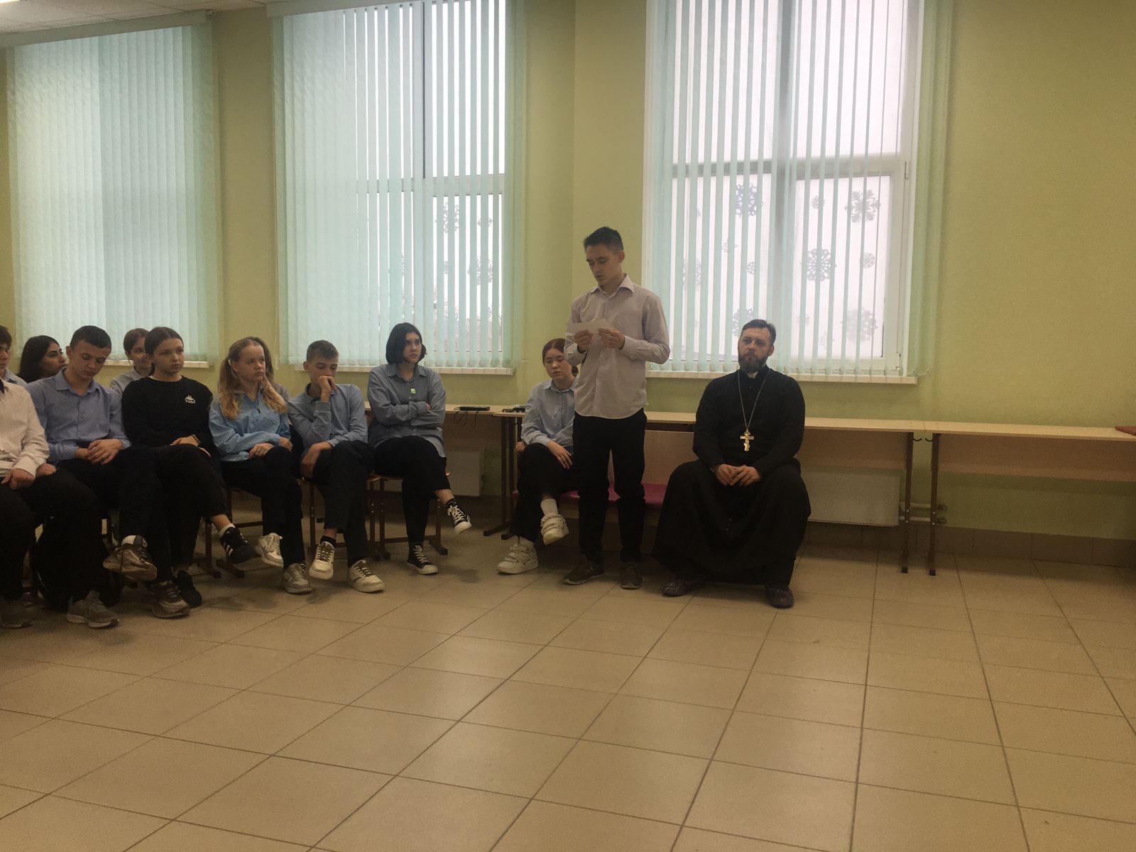 На встречу с учащимися был приглашен священник Илья Буланов, настоятель храма иконы «Всех скорбящих Радость». Он ответил на вопросы ребят и рассказал, как участвовала Русская Православная Церковь в помощи фронту. Также было отмечено, что и сегодня на СВО священники играют важную роль. Они духовно поддерживают воинов перед боем, утешают раненых, молятся о победе нашей армии, проповедуют Слово Божие.