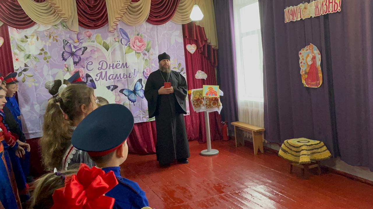 29 ноября 2024 года в Пономаревской СОШ х. Пономарев, Кашарского района прошло торжественное мероприятие, посвященное дню «Матери Казачки». На этот праздник был приглашен настоятель хуторского храма Чуда Архистратига Михаила иерей Алексей Дмитриенко. Перед началом праздника, как и положено у казаков, была прочитана молитва, после чего священник поздравил всех матерей и бабушек с этим замечательным праздником, пожелав им здоровья, долгих лет жизни и помощи Божией в нелегком деле воспитания детей. Затем состоялся школьный праздничный концерт.