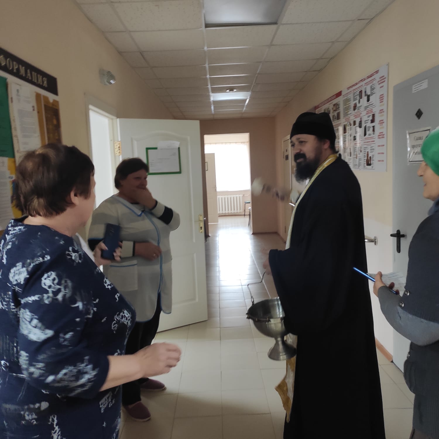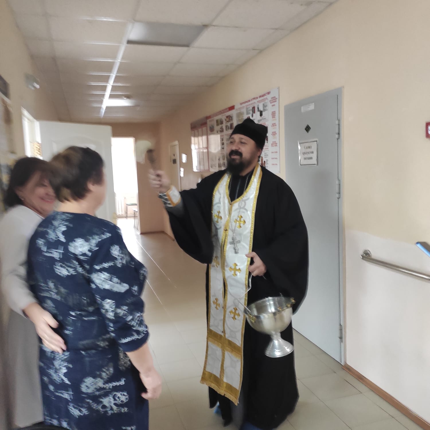 Священник окропил Крещенской водой помещения и сотрудников центра, а также постояльцев учреждения. Поздравил с праздником Крещения Господня и вручил гостинцы.