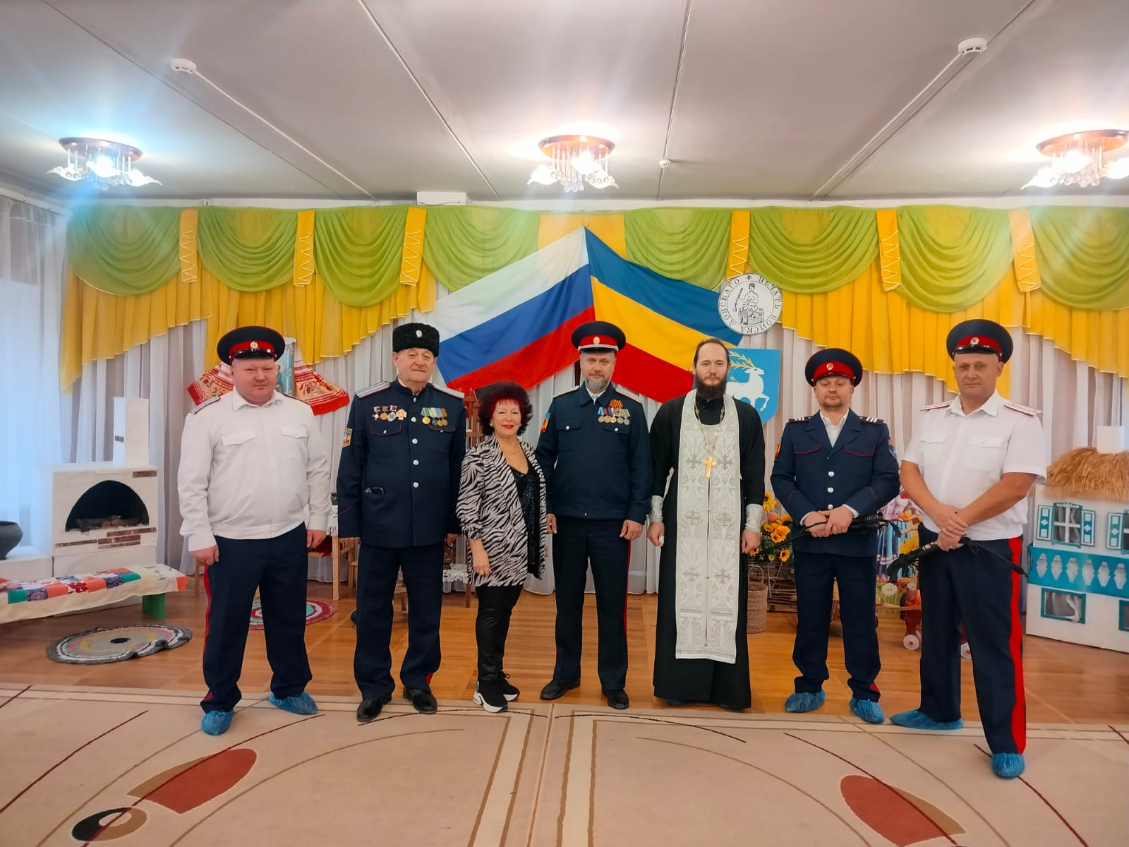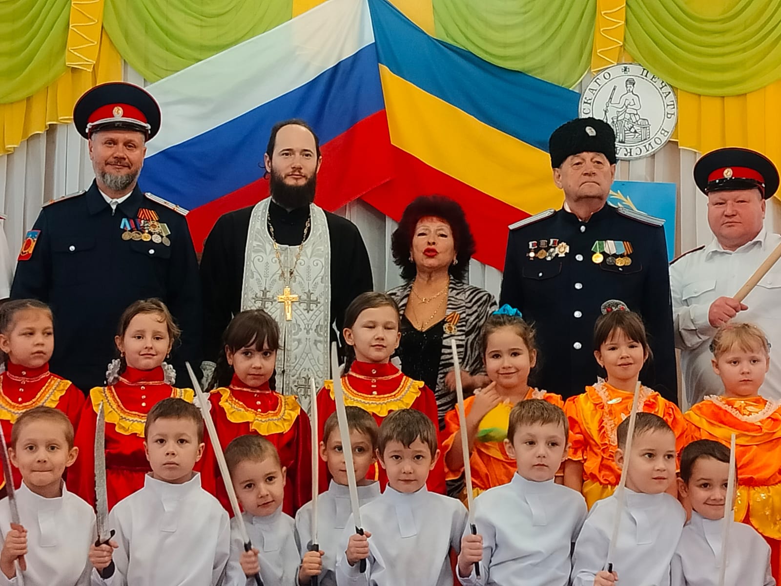 Торжественную присягу для детей перед Честным Крестом и Евангелием зачитывал атаман Казачьей организации «Казачье единство» Всевеликого Войска Донского Готовцев Андрей Сергеевич. После этого священник прочитал молитву и окропил детей и сотрудников детского сада святой водой, сказав напутственное слово, в котором призывал придерживаться христианских и казачьих ценностей и добродетей, избегать нехороших компаний и плохих дел, а воспитателям пожелал Божьей помощи в их нелегком деле.