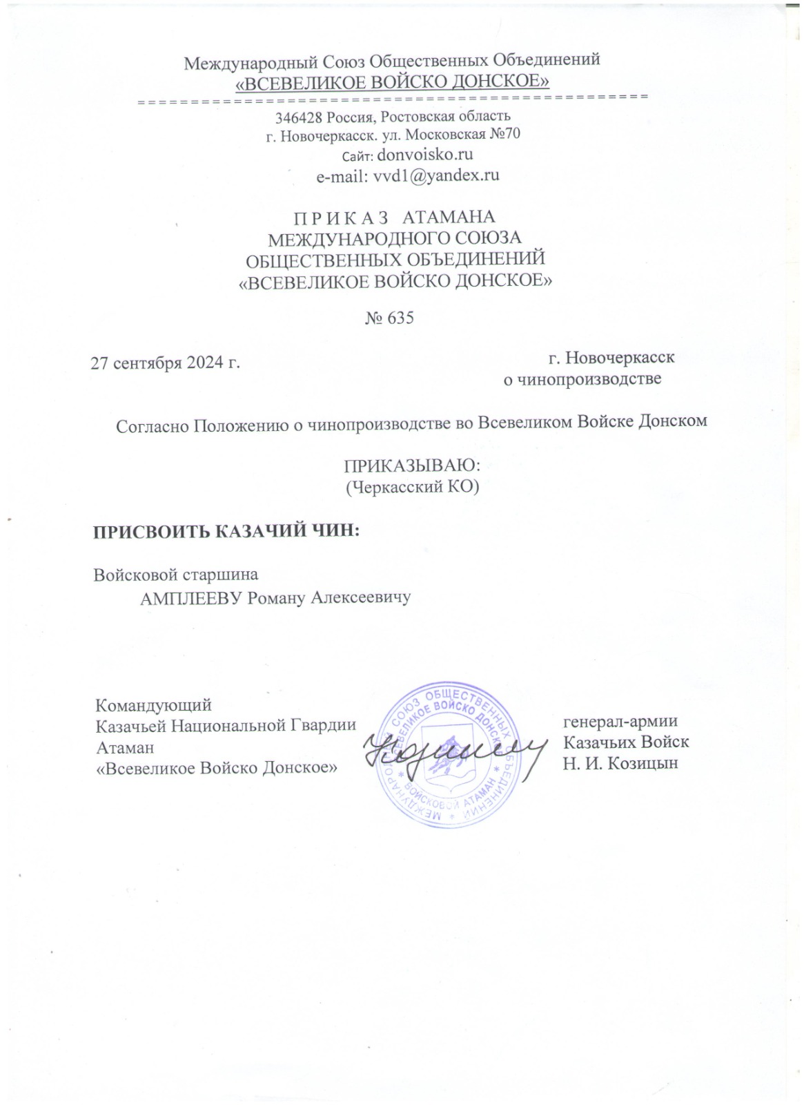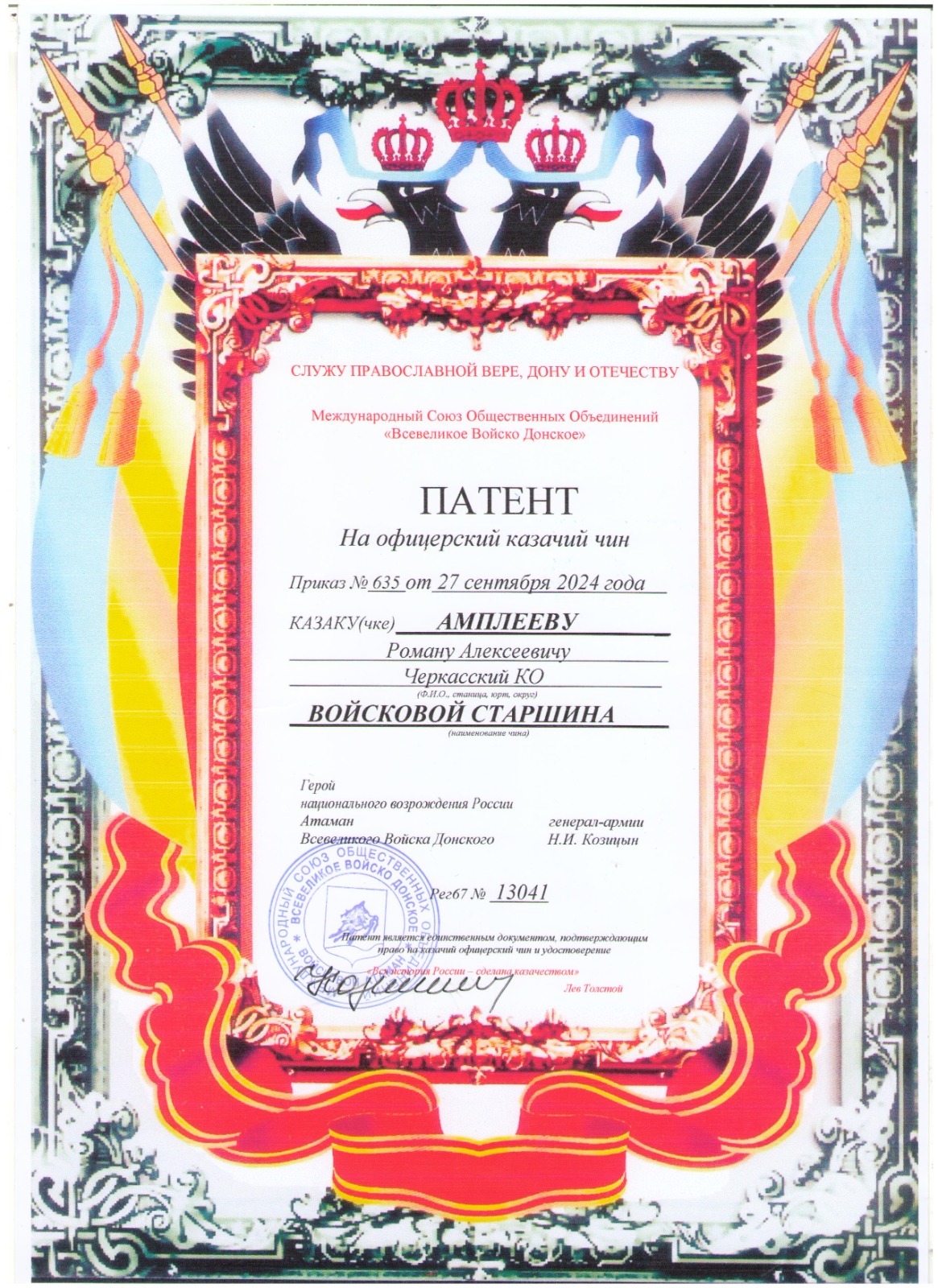 Протоиерею Роману Амплееву вручили патент о присвоении звания войскового старшины