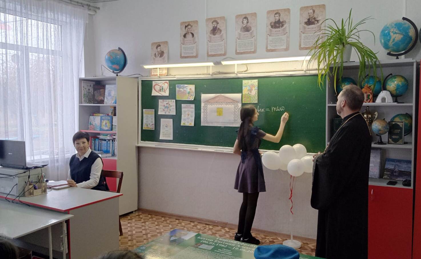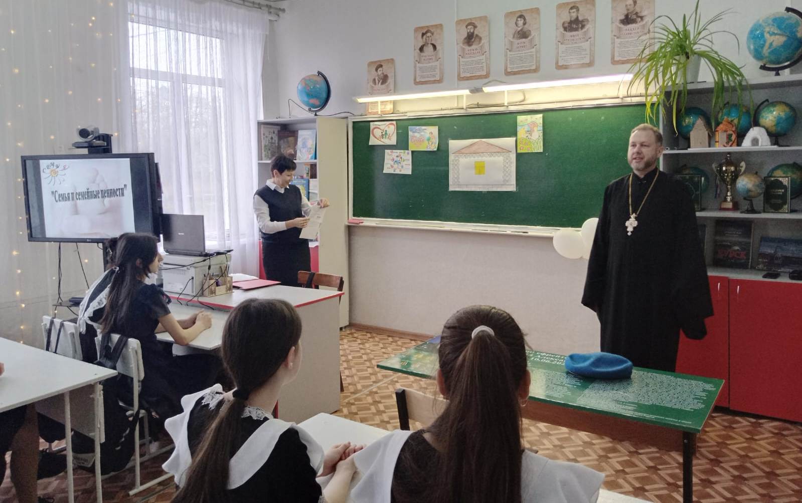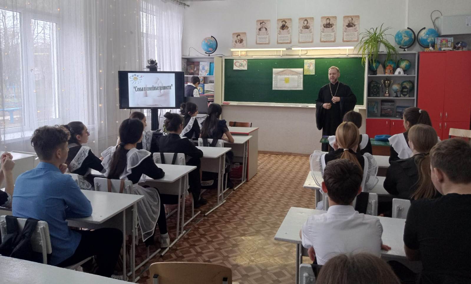 В средней школе п. Отрадный Багаевского района, в рамках мероприятий года Семьи прошло занятие на тему «Семейные ценности – главные ценности». В беседе со старшеклассниками принял участие настоятель храма святого преподобного Серафима Саровского п. Отрадный протоиерей Роман Мясников.