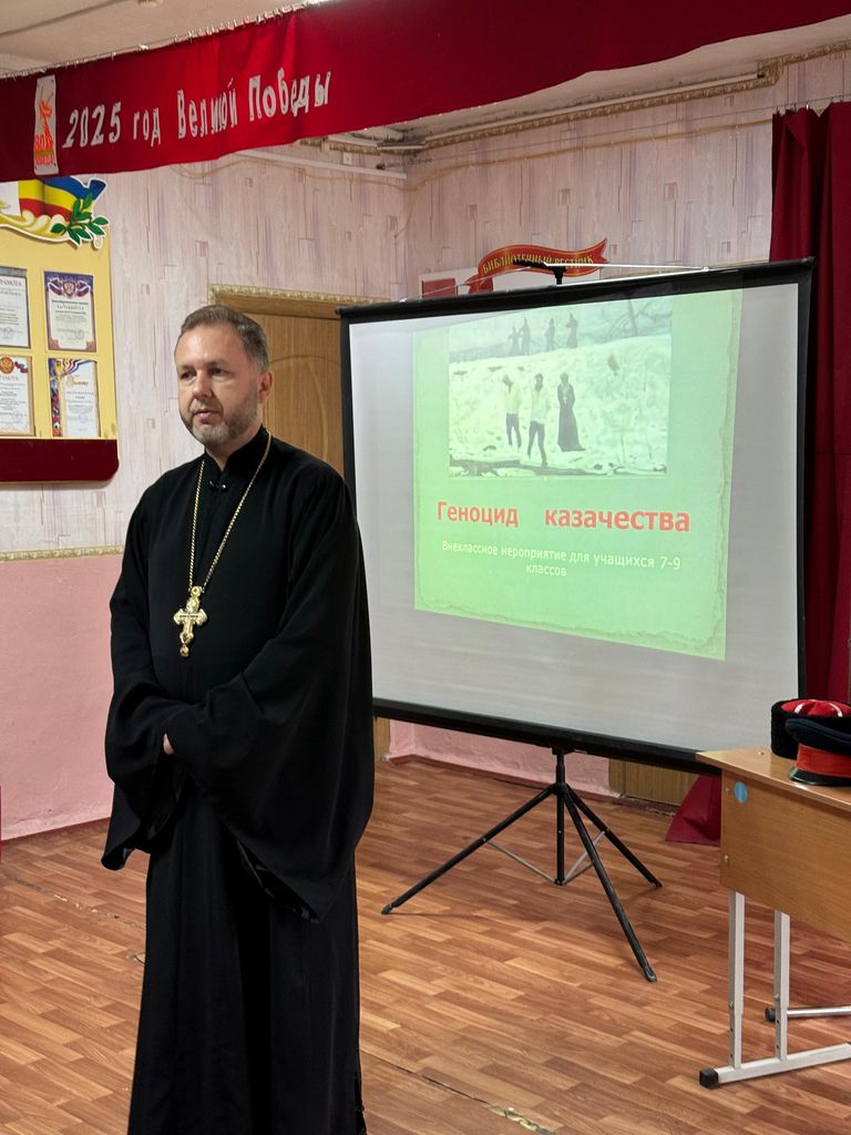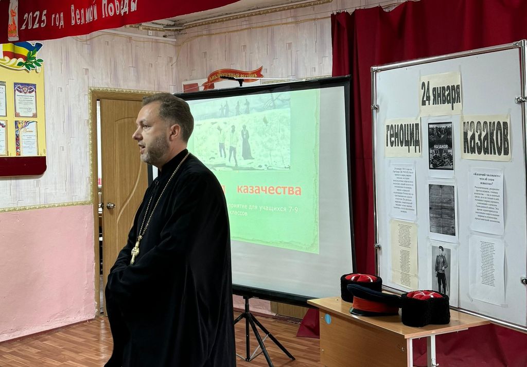 В день памяти начала геноцида казачества в Усьманской основной школе Багаевского района прошло мероприятие для учащихся 6-9 классов, в котором принял участие настоятель прихода святого великомученика Георгия Победоносца х. Усьмана протоиерей Роман Мясников. В начале встречи священник отметил, что в истории России не раз были трагические периоды, показал их духовные причины и то, что уход от веры всегда приводит к негативным последствиям, как в жизни государства, так и в жизни людей. События начала XX века не были исключением.