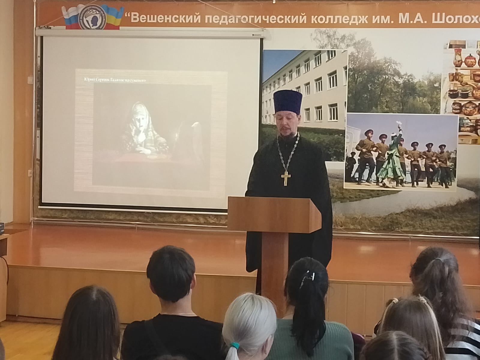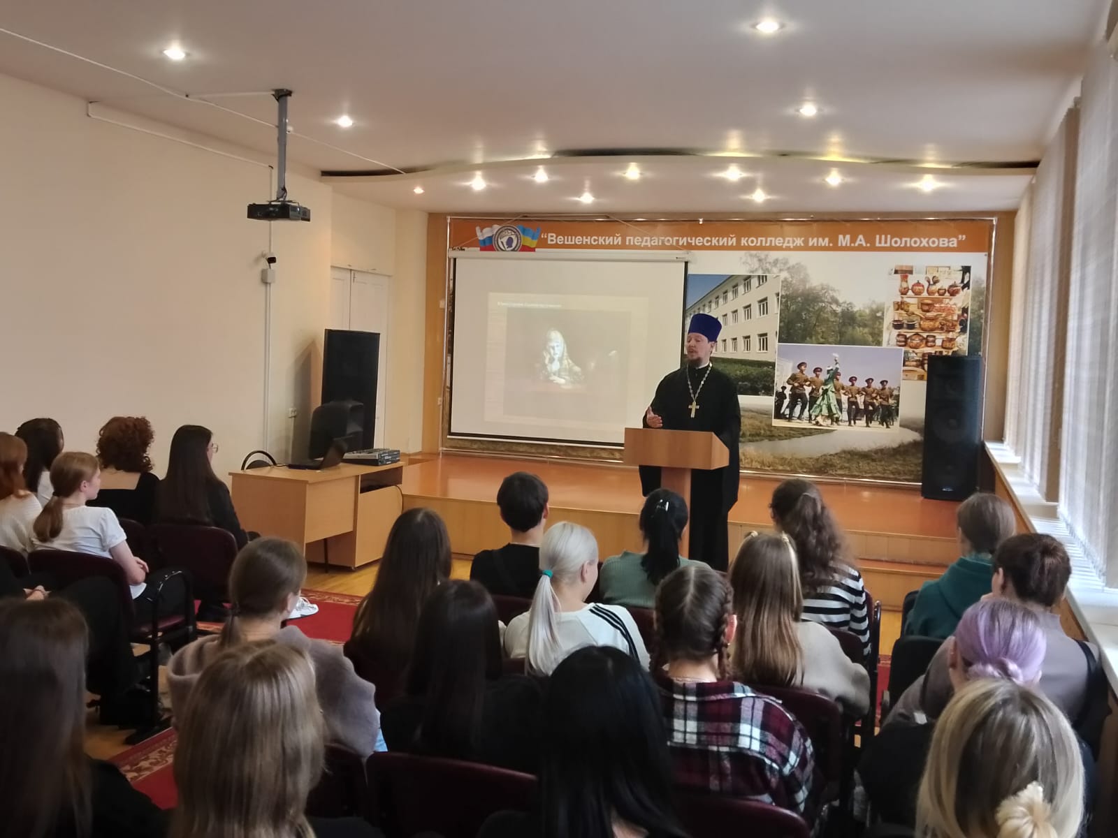 В рамках социального партнерства в воспитательной деятельности образовательной организации со Свято-Михайло-Архангельским приходом станицы Вешенской, в беседе принял участие Благочинный Верхнедонского округа иерей Роман Митяшин.