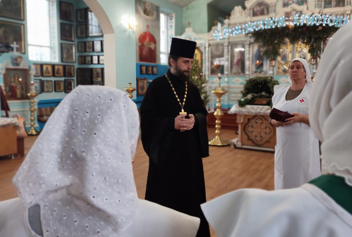 Священник поздравил сестёр с великим праздником и поблагодарил их за их служение. В процессе общения, духовник говорил с сестрами об особенности сестринского служения и его неразрывной связи с правильным устроением духовной жизни: «Главная добродетель сестры милосердия – «милующее сердце», оно не может черпать силы из пустого источника. Господь наполнит сердце милостью, если источник духовных сил искать в литургической молитве и причащении Святых Христовых Таин. Ваше служение не просто работа, когда выполняешь определенный круг обязанностей и все, это когда человек жертвует своим временем и силами ради ближнего. Милосердие могут иметь и те люди, которые не верят в Бога, но совершают в своей жизни добрые дела. Но просто добрые дела ради добрых дел не имеют смысла. Они могут стать первой ступенькой ко Христу, но если этой встречи со Христом не произойдет, то спасению души эти дела не послужат».