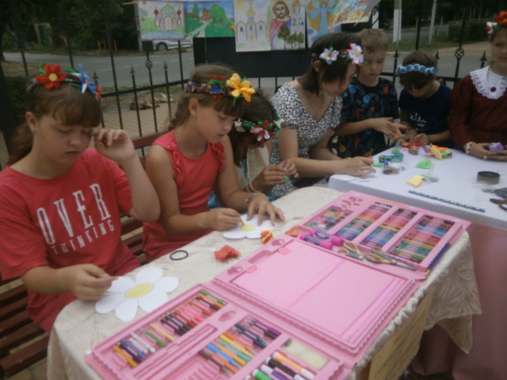 Дети познакомились с историей праздника, читали стихи русских классиков, посвященные празднику Святой Троицы, участвовали в мастер-классе «Умелые ручки» и «Рисую Божий мир». Старшая группа – волонтеры вместе с воспитателями лагеря провели акцию милосердия «Белый цветок» среди прихожан.