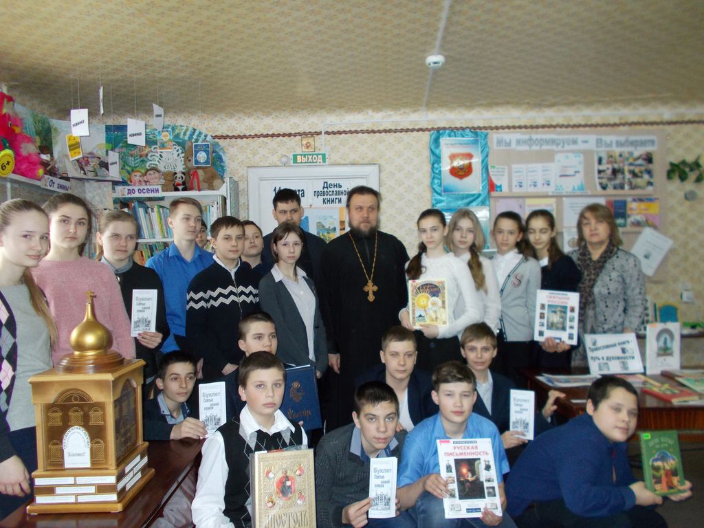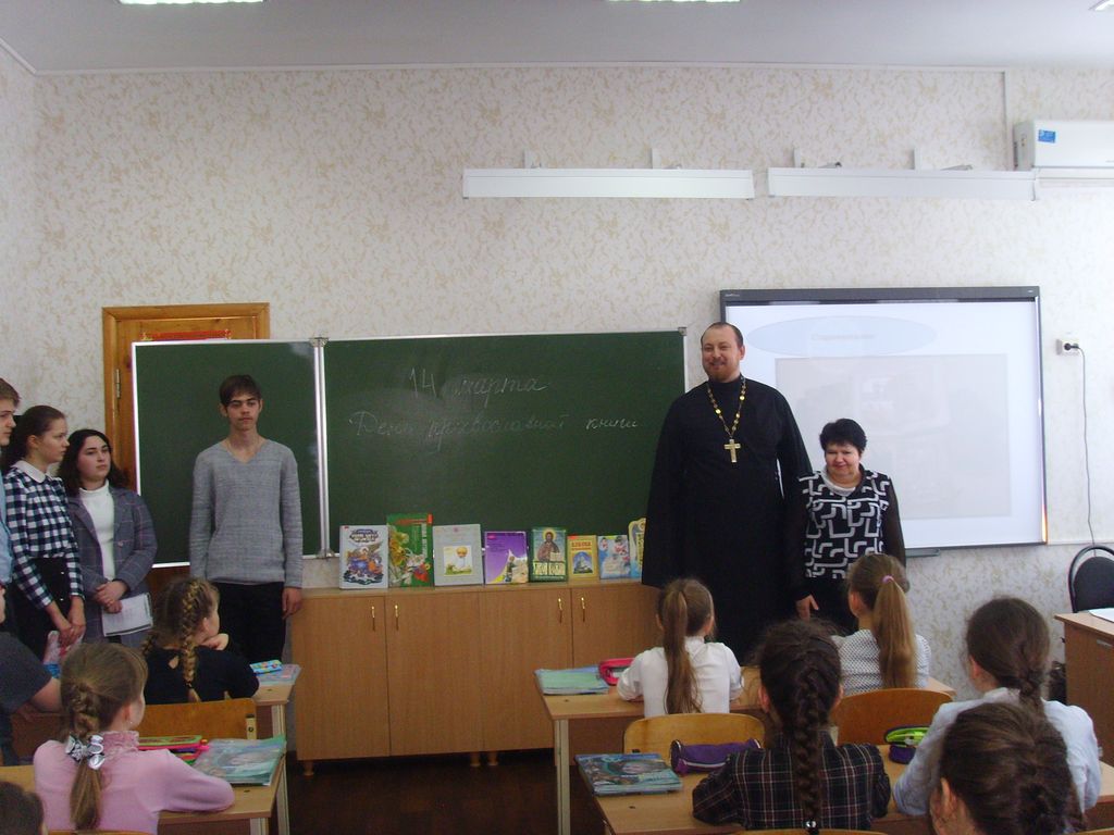 С праздником православной книги ребят пришел поздравить настоятель храма в честь Донской иконы Божией Матери, благочинный Приходов Новошахтинского округа Шахтинской Епархии председатель епархиального отдела по взаимоотношению Церкви и общества, член Издательского Совета Шахтинской епархии, протоиерей Роман Амплеев. Он рассказал присутствующим о значении чтения духовной и классической литературы, коснулся темы современного телевидения, рекомендовал ребятам читать познавательные и поучительные книги.