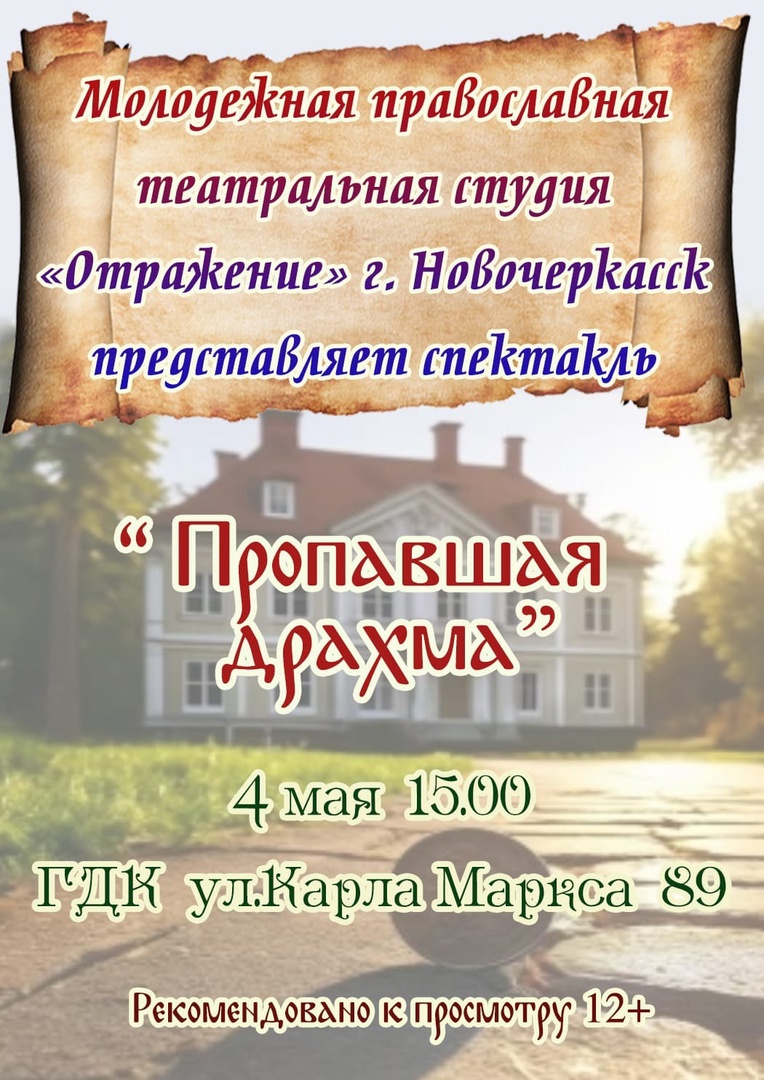4 мая в Городском дворце культуры состоялся показ спектакля «Потерянная драхма» молодежной православной театральной студии «Отражение» из г. Новочеркасск.