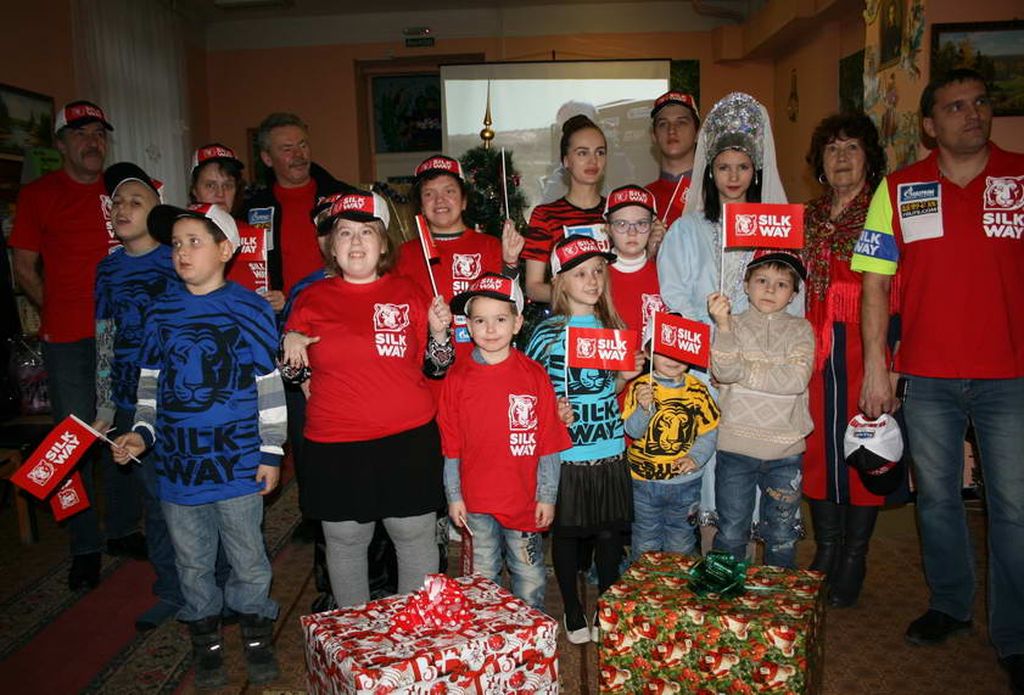 Гости новогоднего праздника: представители ралли-марафона «Шёлковый путь – 2018» в составе Коженова Ю.А., руководителя бивуачной группы Тыщук Евгения – коменданта бивуака, Шашлюк Алисы – специалиста дирекции маркетинга также поздравили детей с наступающими праздниками, пожелали каждой семье благополучия, а детям настойчивости в достижении цели и подарили подарки.