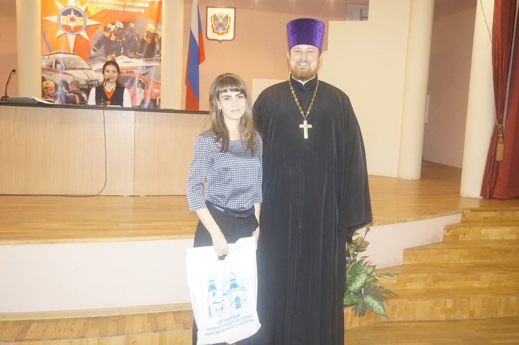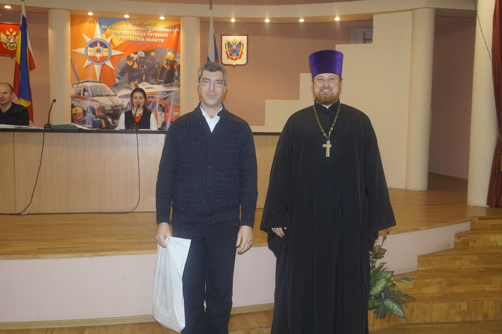 От имени духовенства Шахтинской епархии спасателей поздравил протоиерей Роман Амплеев, являющийся руководителем сектора по взаимодействию с МЧС России и Департаментом по предупреждению и ликвидации чрезвычайных ситуаций Ростовской области в Шахтинской епархии.