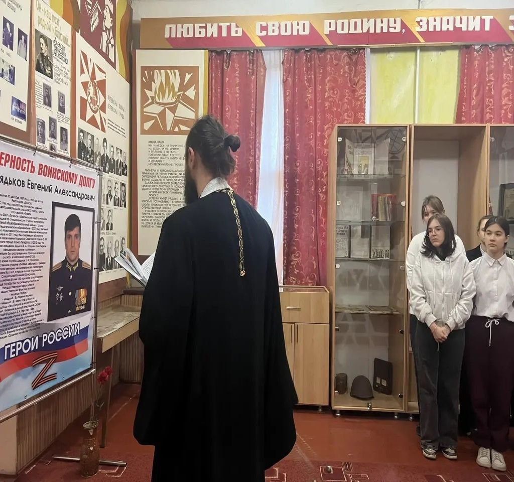 Панихиду совершил настоятель Свято-Покровского храма иерей Олег Брехов. В мероприятии приняли участие директор школы Анна Александровна Ранова, а также педагоги и учащиеся, для которых имя Евгения Дядькова стало символом мужества и верности присяге.