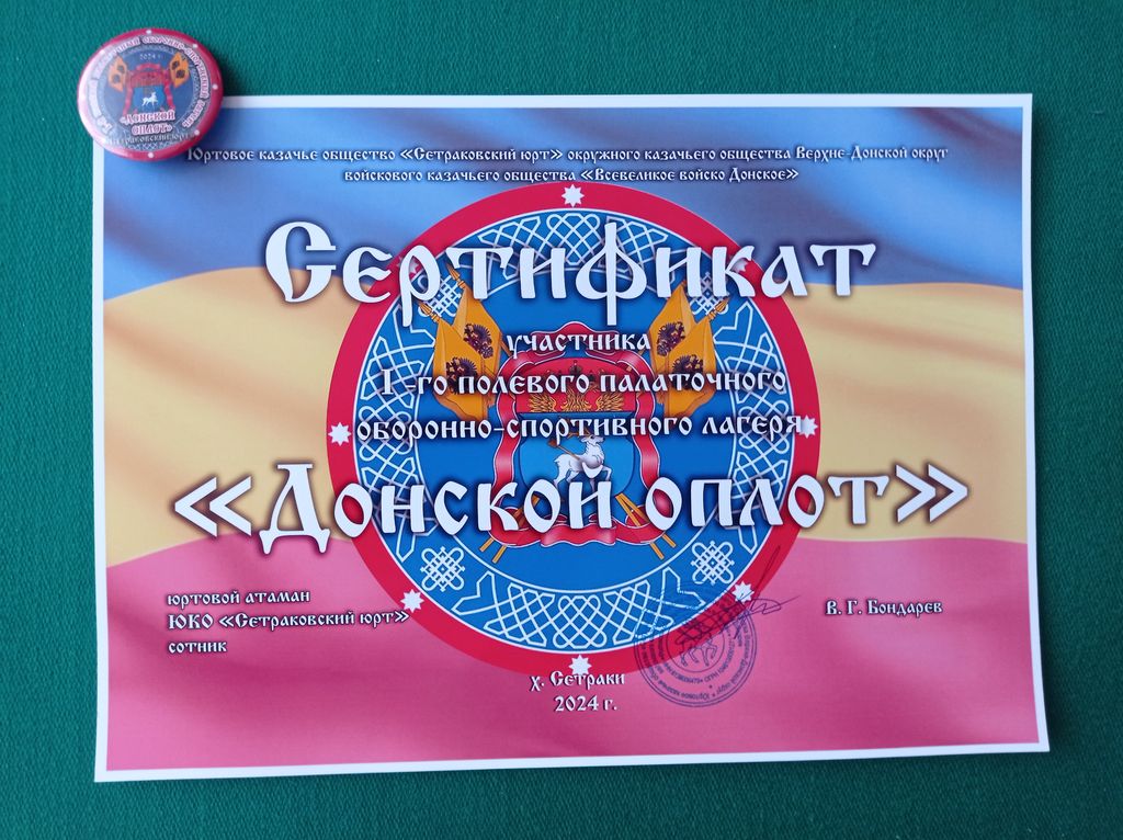 19 августа в 1000 на торжественном закрытии полевого палаточного оборонно-спортивного лагеря «Донской оплот» всем участникам, как детям, так и взрослым, обеспечивавшим работу лагеря, был вручён Сертификат и эксклюзивный значок к сертификату, участника I-го полевого палаточного оборонно-спортивного лагеря «Донской оплот».