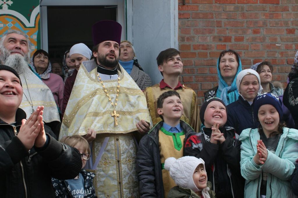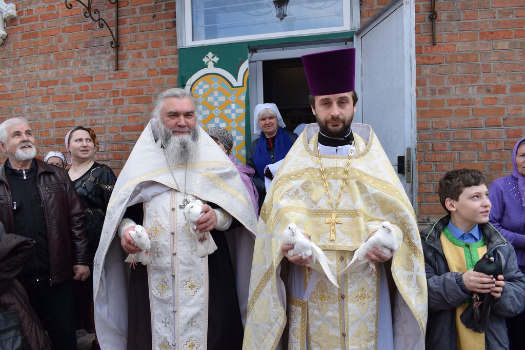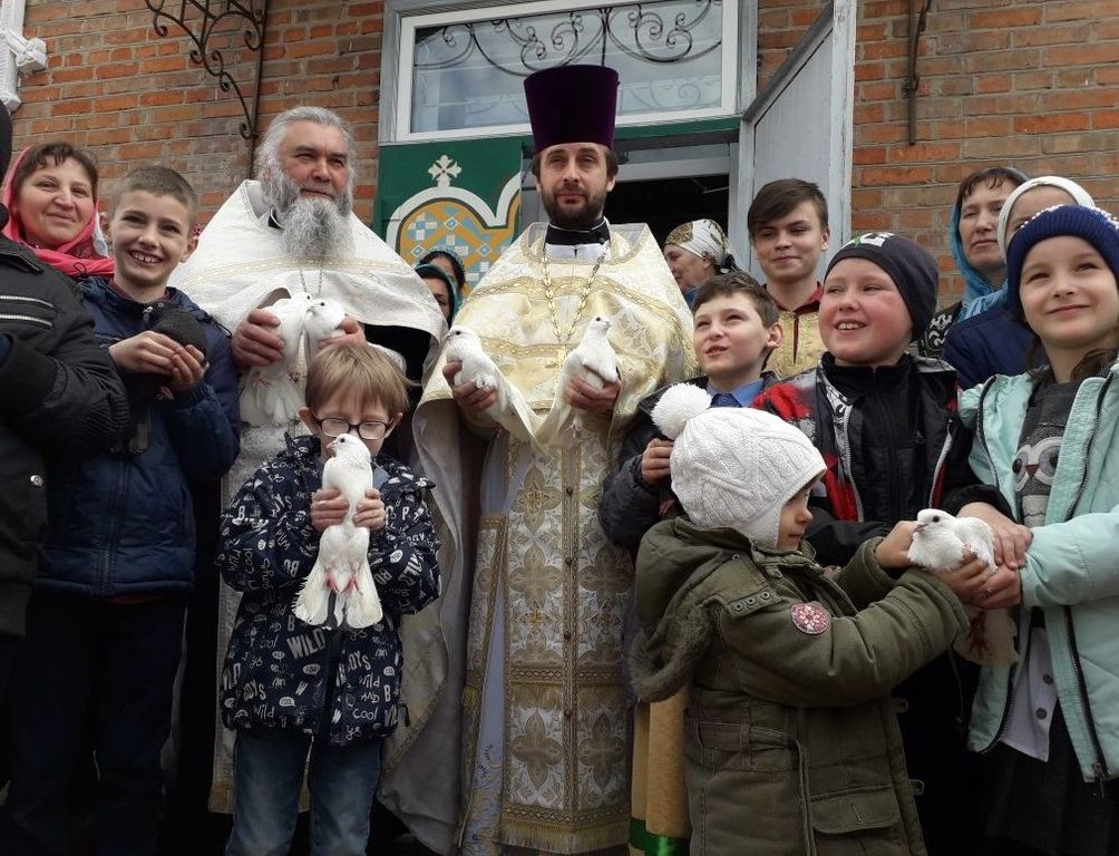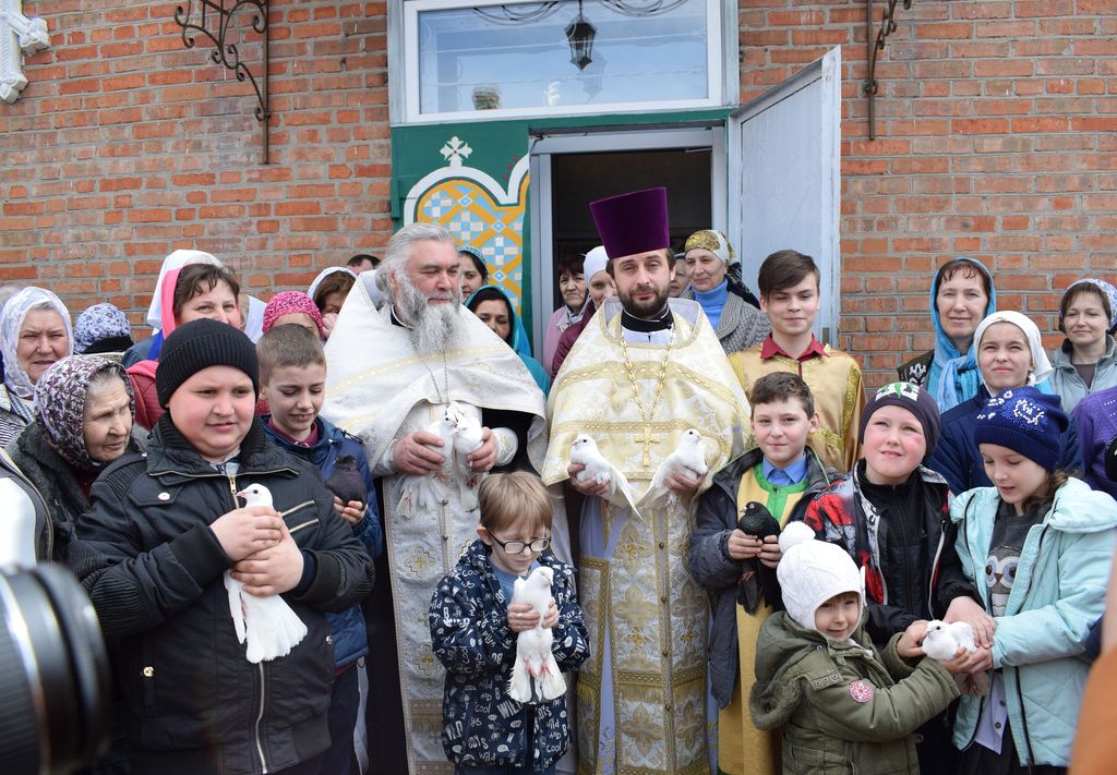 В день Великой Субботы и праздника Благовещения Пресвятой Богородицы после Богослужения в храме Архангела Михаила п. Каменоломни, по традиции настоятель храма, благочинный приходов Нижнедонского округа протоиерей Сергий Яценко, клирик храма иерей Алексий Чумак, прихожане и дети церковно-приходской воскресной школы «Благовест» выпустили в небо белых голубей.