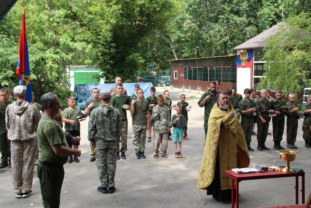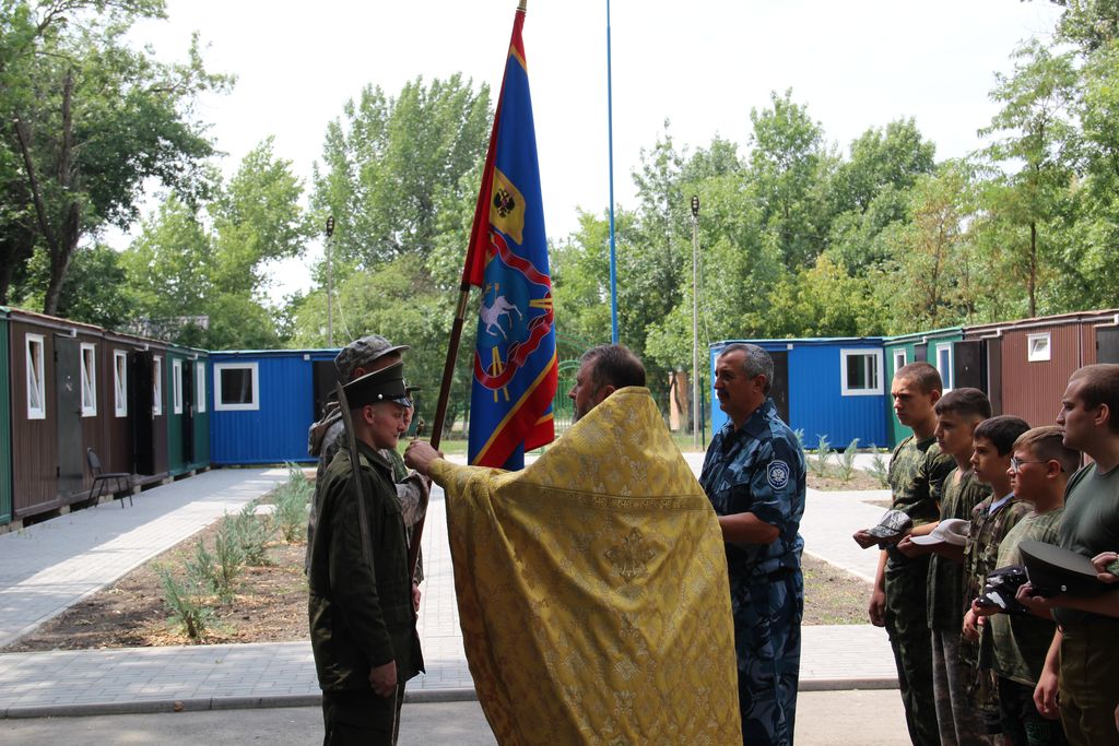 В день открытия сборов руководитель Отдела Шахтинской епархии по взаимодействию с казачеством – протоиерей Александр Маштанов совершил молебное пение о призывании помощи Святаго Духа перед началом всякого благого дела. После молебна священник призвал на всех Божие благословение, окропив казачат Крещенской водой.