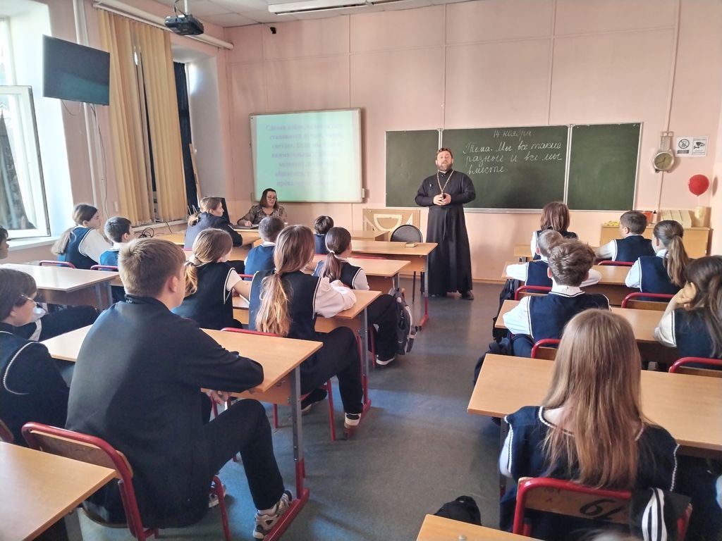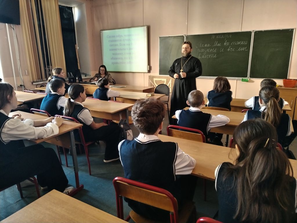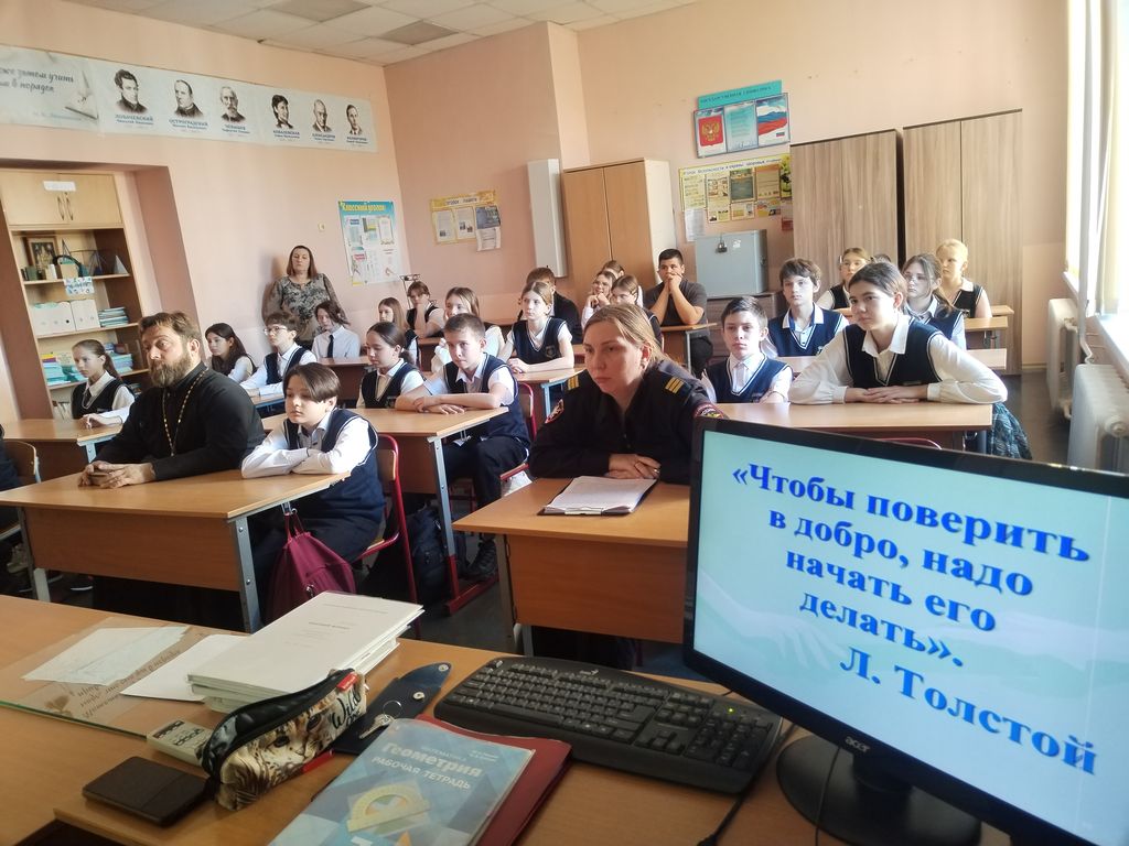 Классный руководитель 7 «в» класса С. В. Чуканова начала мероприятие с обсуждения высказывания «Чтобы поверить в добро, надо начать его делать!» Эти слова великого русского писателя и мыслителя Льва Николаевича Толстого стали девизом мероприятия. Подростки посмотрели презентацию и узнали, что в коллективе всегда действуют «правила трех «С»: сотрудничество, сочувствие, самоконтроль. Вместе с классным руководителем и гостями школы побеседовали о значение этих правил. Настоятель храма апостола Андрея Первозванного г. Миллерово иерей Симеон Есин рассказал ребятам о том, что главное в общении между людьми в коллективе - это искренность, поддержка друг друга, доверие, взаимопонимание и взаимовыручка, сострадание к ближнему. Инспектор ГПДН линейного отдела полиции на ст. Миллерово младший лейтенант полиции О. Н. Локтева сообщила ребятам о мерах ответственности несовершеннолетних за правонарушения. В конце мероприятия школьники вместе со взрослыми просмотрели и обсудили фильм «О взаимовыручке животных в природе». Подвела итог мероприятия заместитель директора школы Т. В. Осадченко. Она подчеркнула, что доброта, любовь, надежда и вера — важные составляющие, которые наполняют жизнь светом и радостью, открывают человеку путь к Храму Божьему.