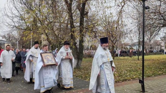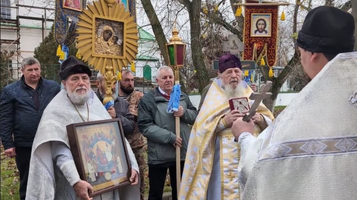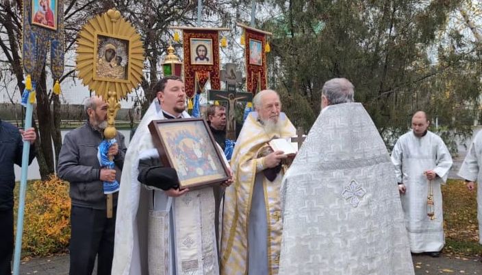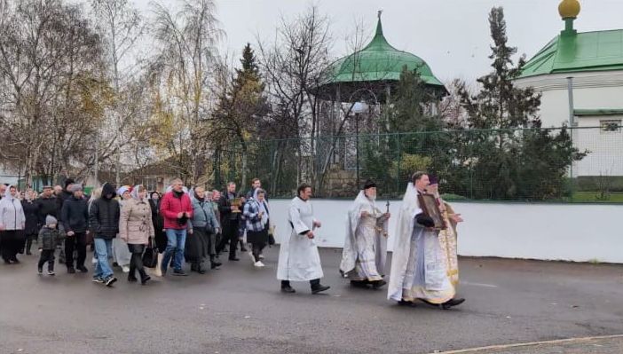 По окончании Божественной литургии был совершен крестный ход вокруг храма с окроплением святой водой и чтением Евангелия.
