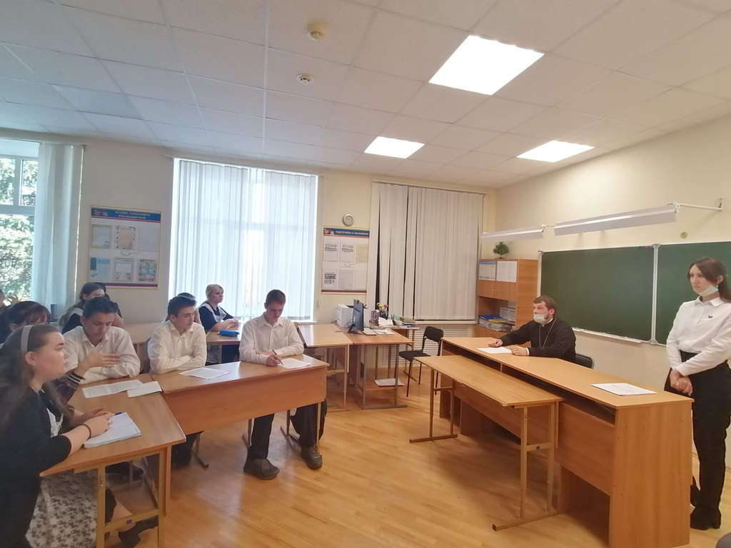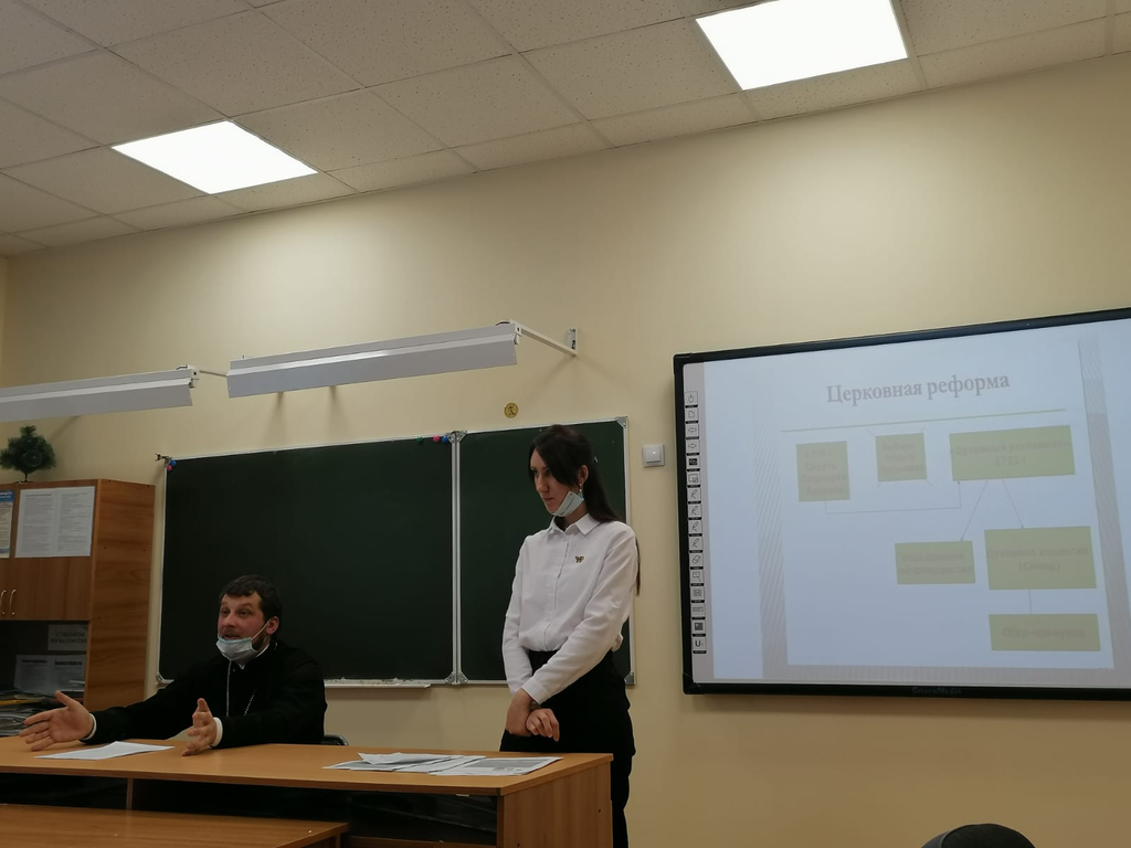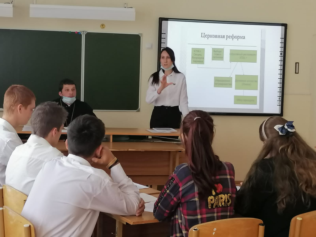 Гостем данного мероприятия был настоятель храма Иоанна Предтечи иерей Александр Левчик. Священник рассказал ученикам о значении реформы Петра I для Русской Православной церкви и ее последствиях.