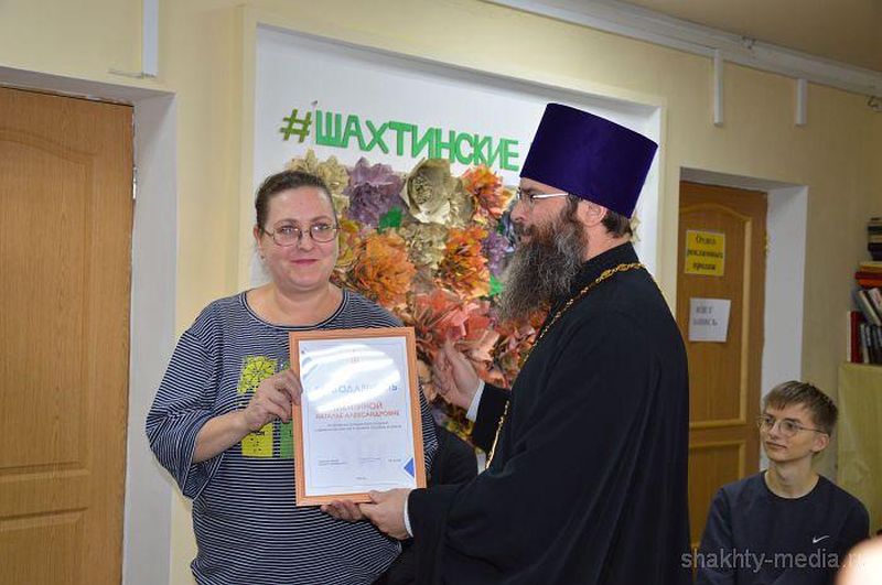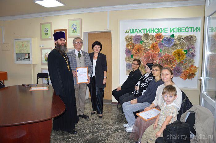 Церемония награждения прошла накануне Дня народного единства в стенах редакции «Шахтинские известия». Секретарь Шахтинской епархии, благочинный Александровск-Грушевского округа, настоятель Покровского кафедрального собора иерей Александр Теличкин и главный редактор газеты «Шахтинские известия» Белла Севостьянова вручили Благодарности руководителю художественной студии им. В.Рогова «Красный кот» Виктории Роговой, руководителю музыкальной группы «Родные напевы» Николаю Сивчуку и ответственному редактору «Шахтинских известий» Наталье Никитиной.