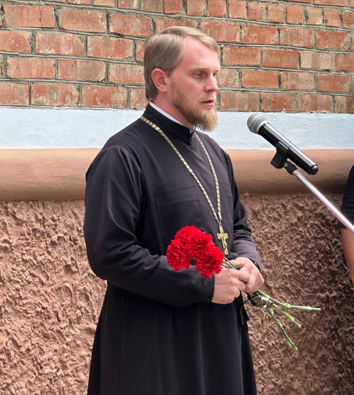 Отец Димитрий освятил мемориальную доску и обратился со словом к присутствующим. В своей речи он подчеркнул важность сохранения памяти о героях, отдавших свою жизнь за мирное будущее.