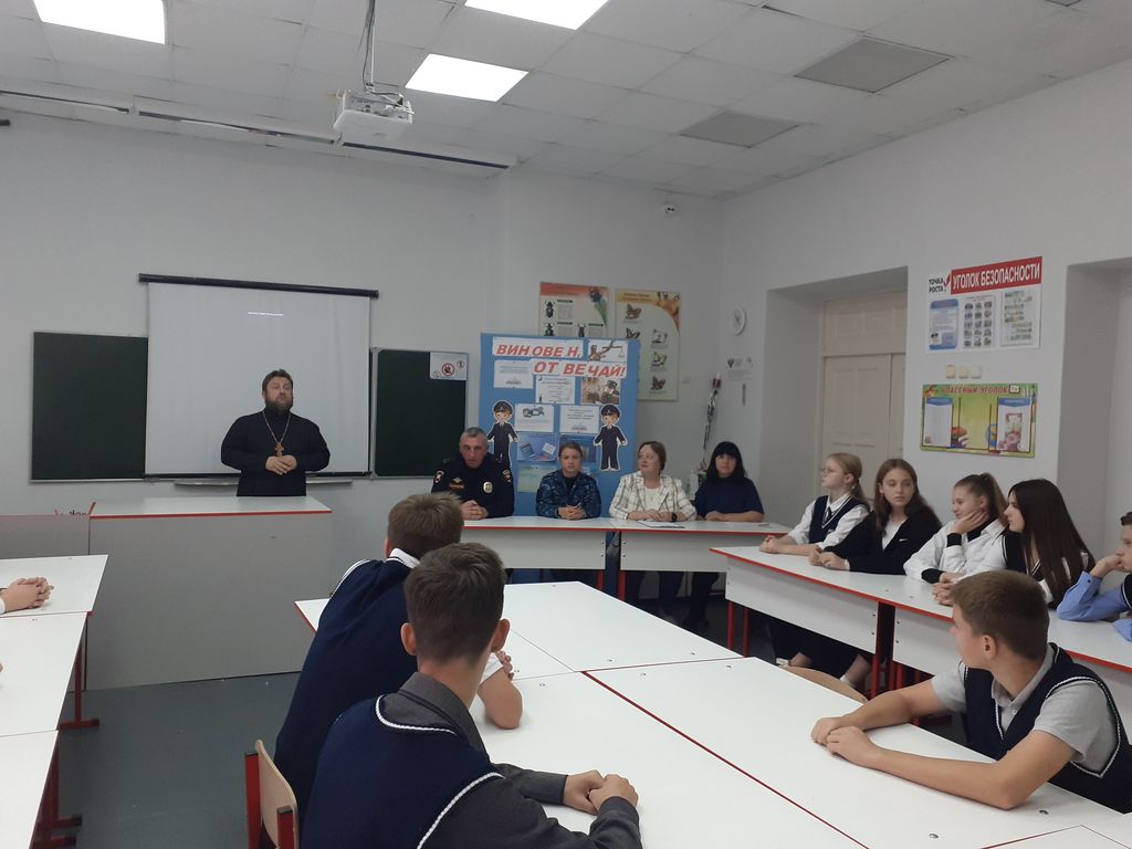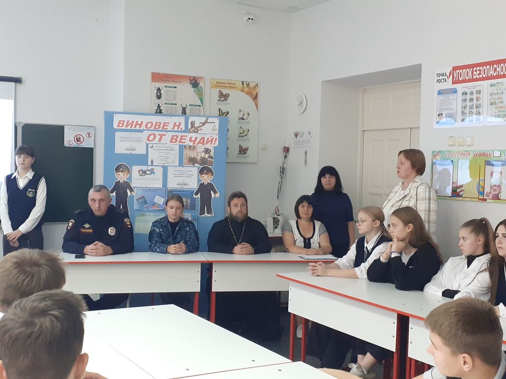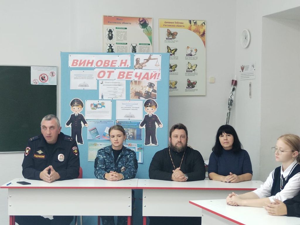 Круглый стол «Виновен – отвечай!» прошел на базе школы № 8 г. Миллерово. В его работе, помимо настоятеля Свято-Андреевского храма иерея Симеона Есина, приняли участие: инспектор по безопасности дорожного движения старший лейтенант полиции Сергей Кавелич, инспектор ОПДН сержант полиции София Макарова, заместитель директора школы Татьяна Осадченко, учителя, школьный уполномоченный по правам ребенка Валентина Бакланова и учащиеся старших классов.
