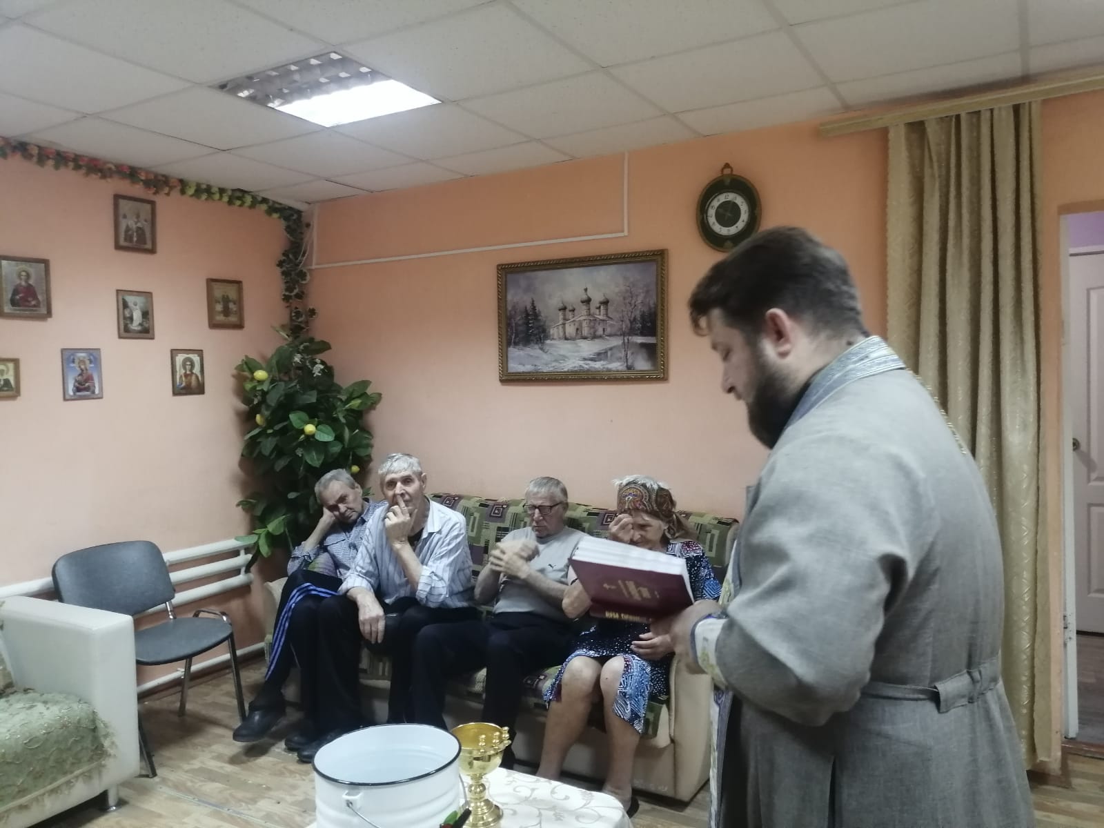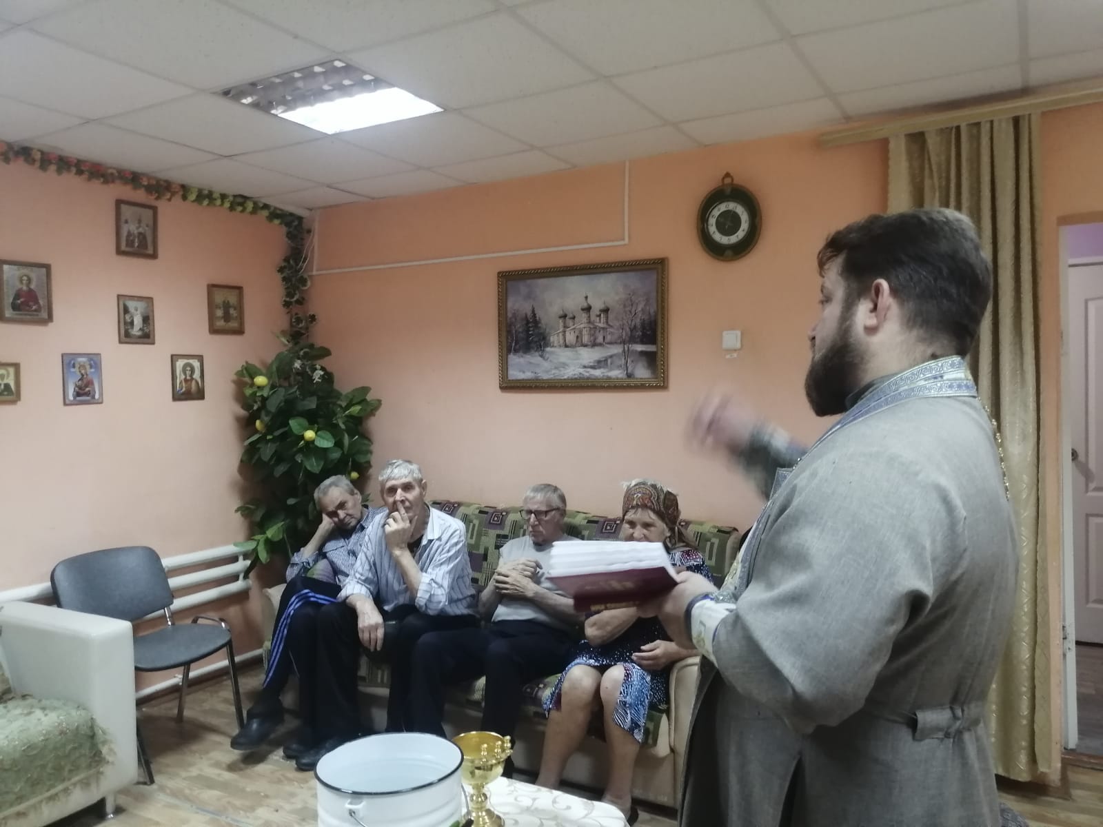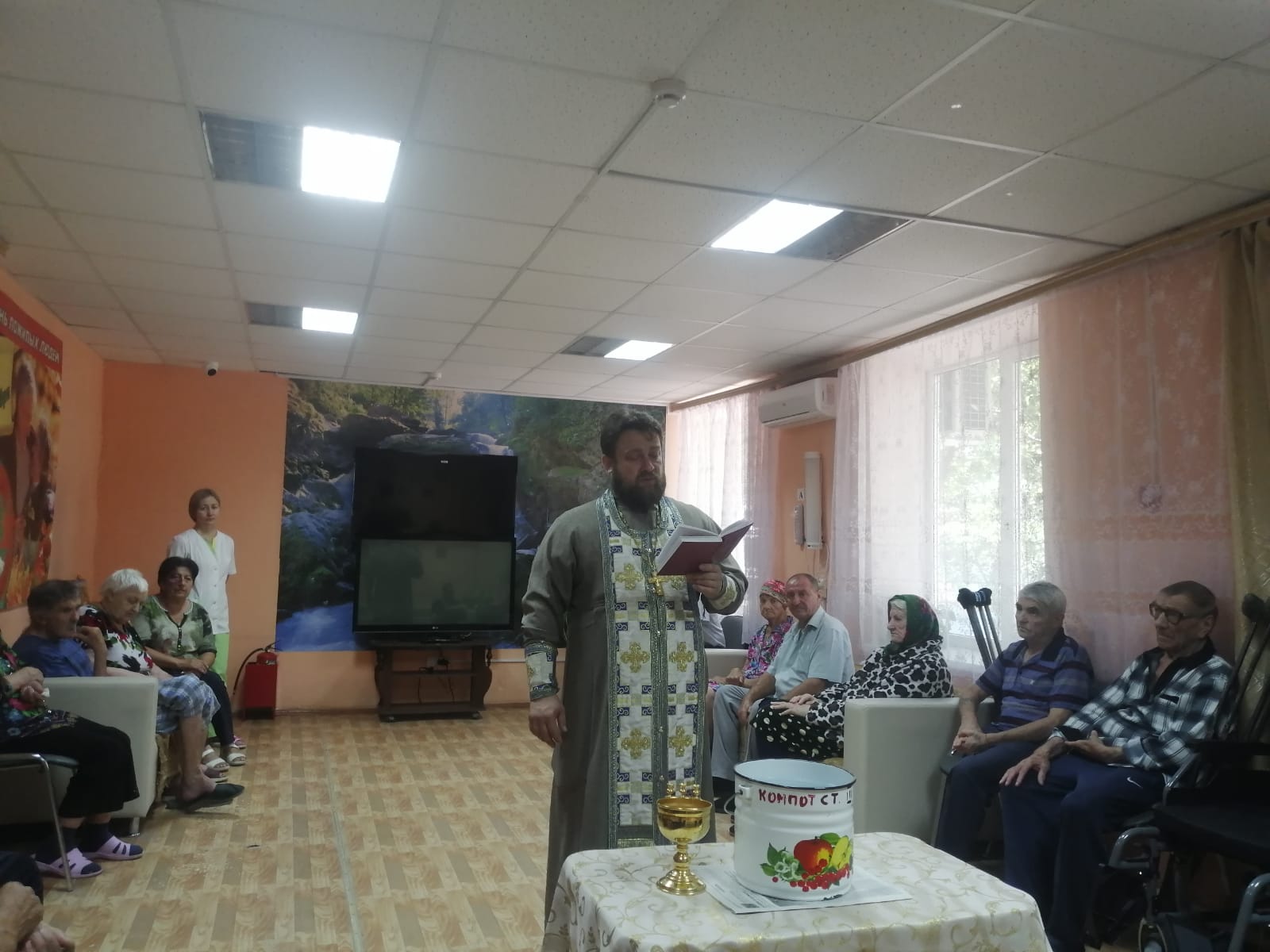 Священник совершил освящение воды, рассказал о празднике, отмечаемом православной церковью 12 июля и окропил святой водой все комнаты насельников социального учреждения.