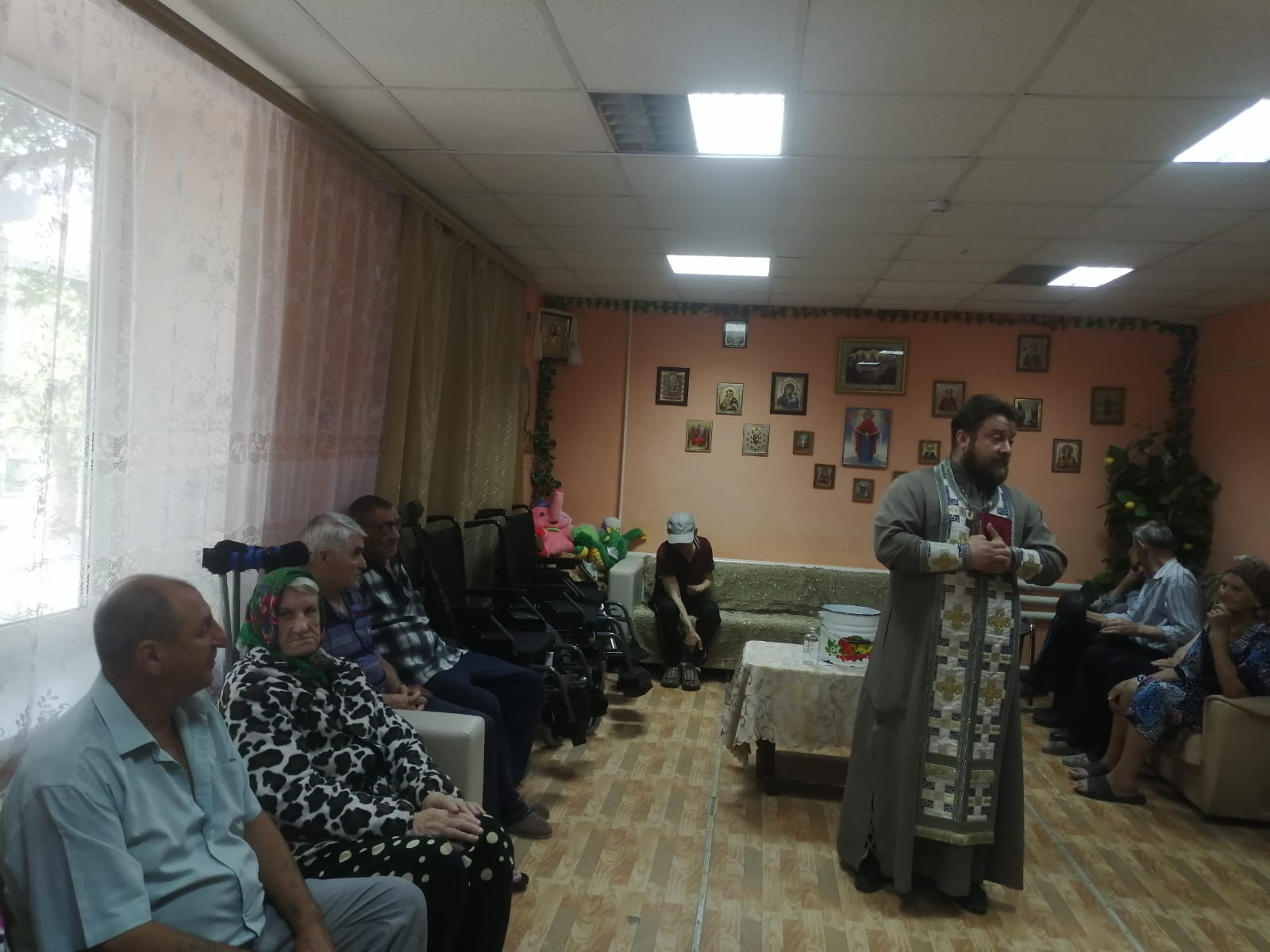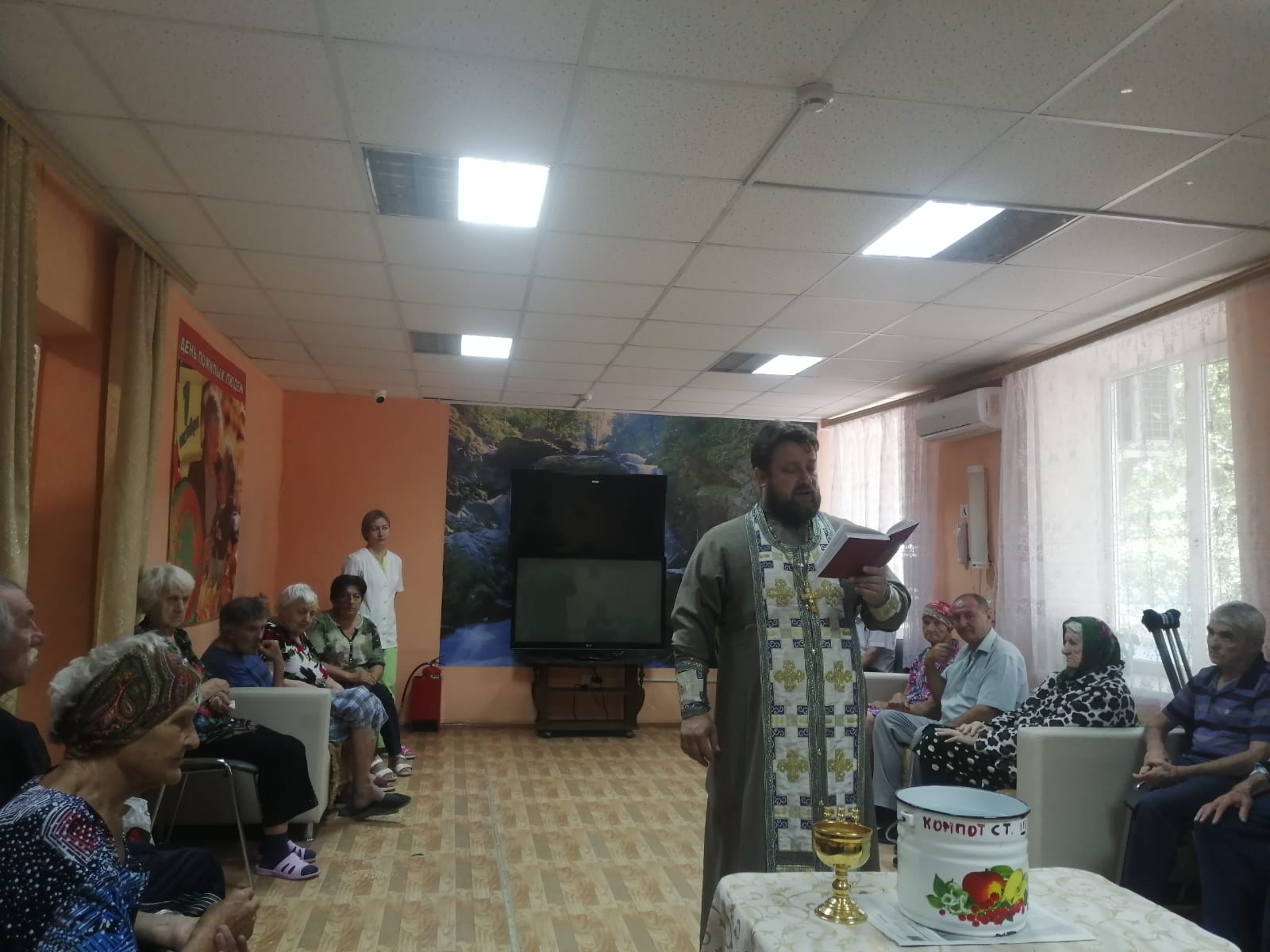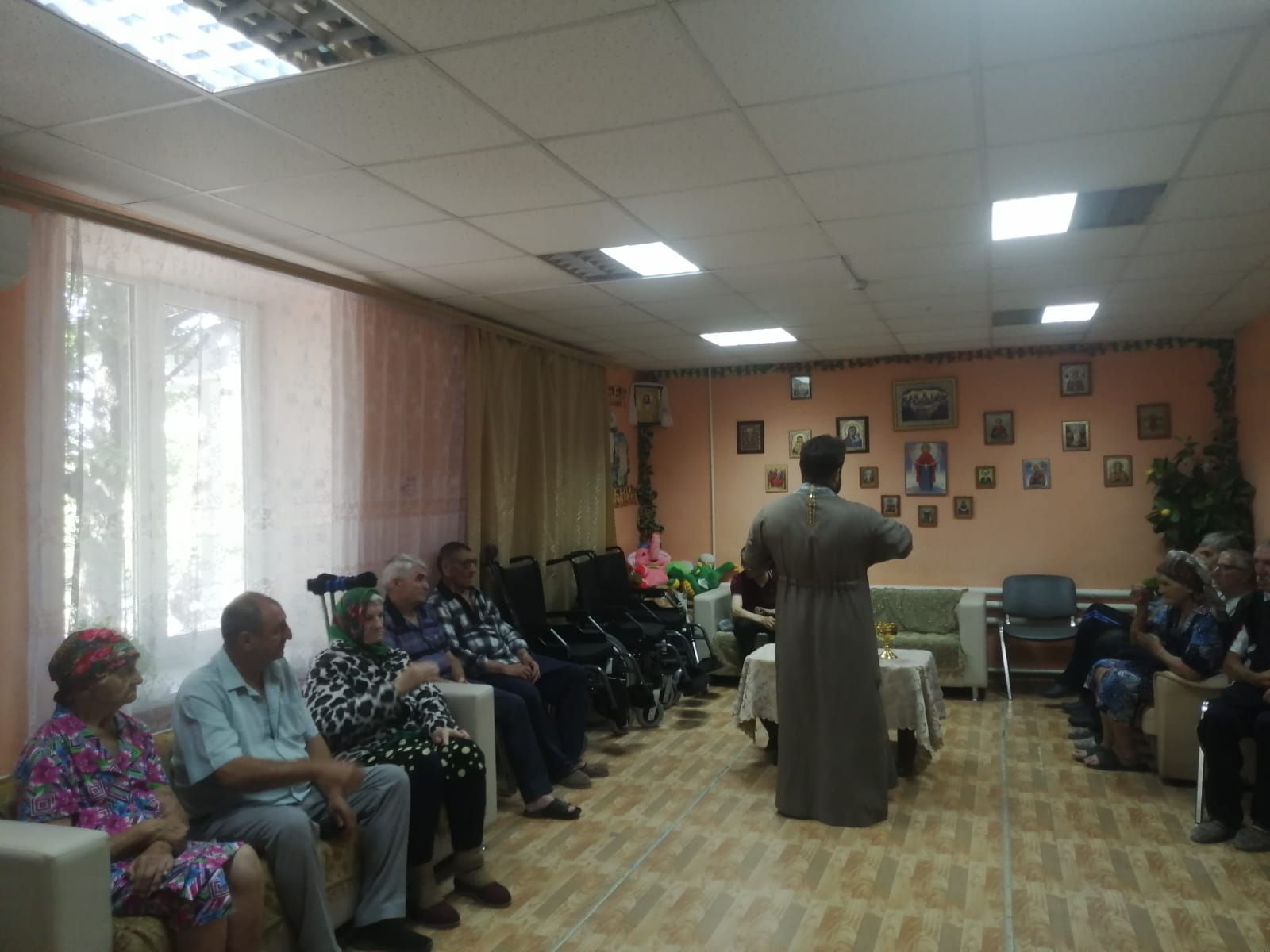 Священник совершил освящение воды, рассказал о празднике, отмечаемом православной церковью 12 июля и окропил святой водой все комнаты насельников социального учреждения.