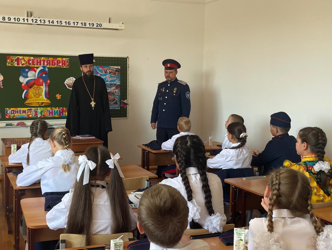 В День знаний благочинный приходов Нижнедонского округа протоиерей Сергий Яценко и атаман хуторского казачьего общества «Староковыльное» Нижнедонского Юрта Алексей Точеный посетили казачий класс школы и поздравили четверокласников с праздником.