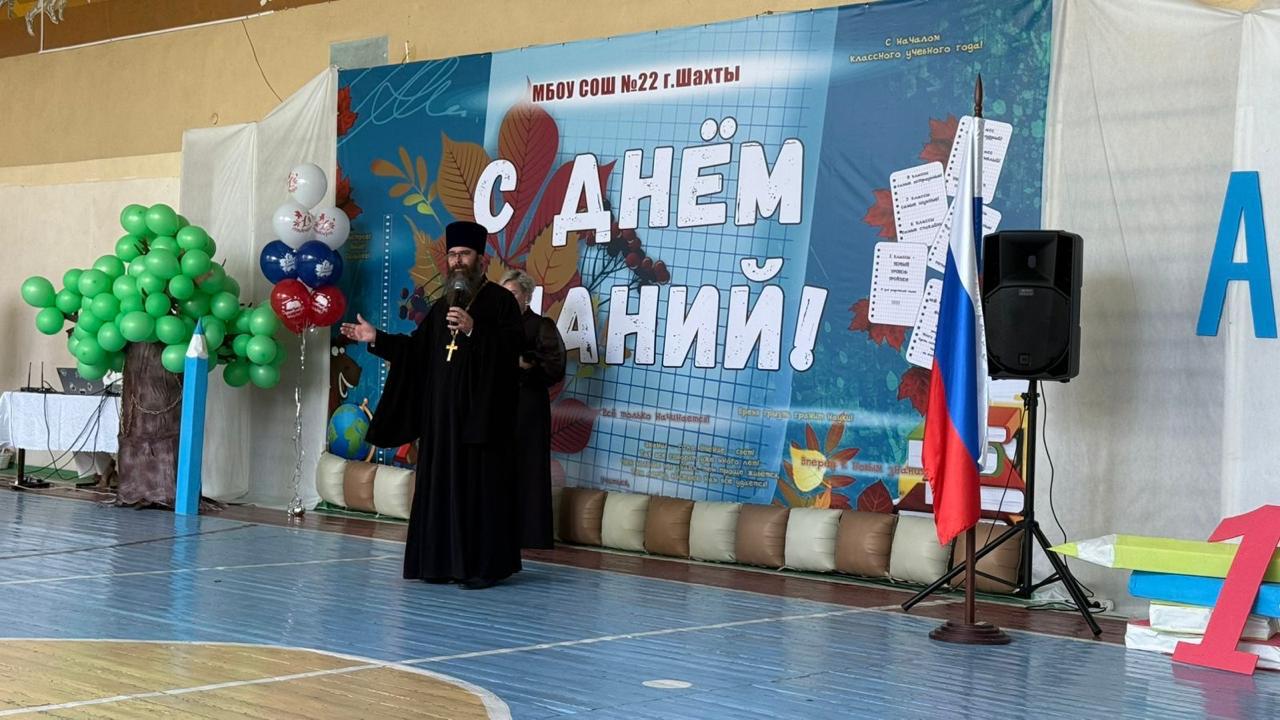 На новый учебный год учеников и учителей школы № 22 напутствовал благочинный Александровск-Грушевского округа иерей Александр Теличкин.