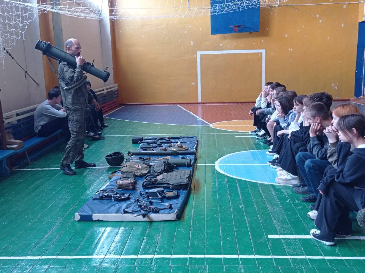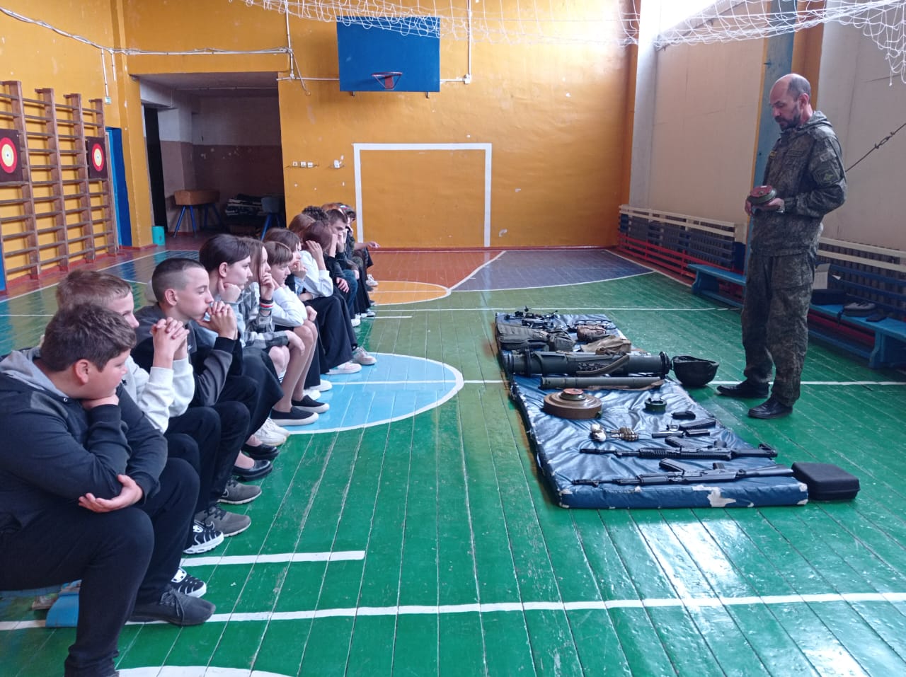 После слово взял атаман юртового казачьего общества подъесаул Бондарев В. Г., который познакомил ребят с вооружением и техническими средствами Вооружённых сил России.