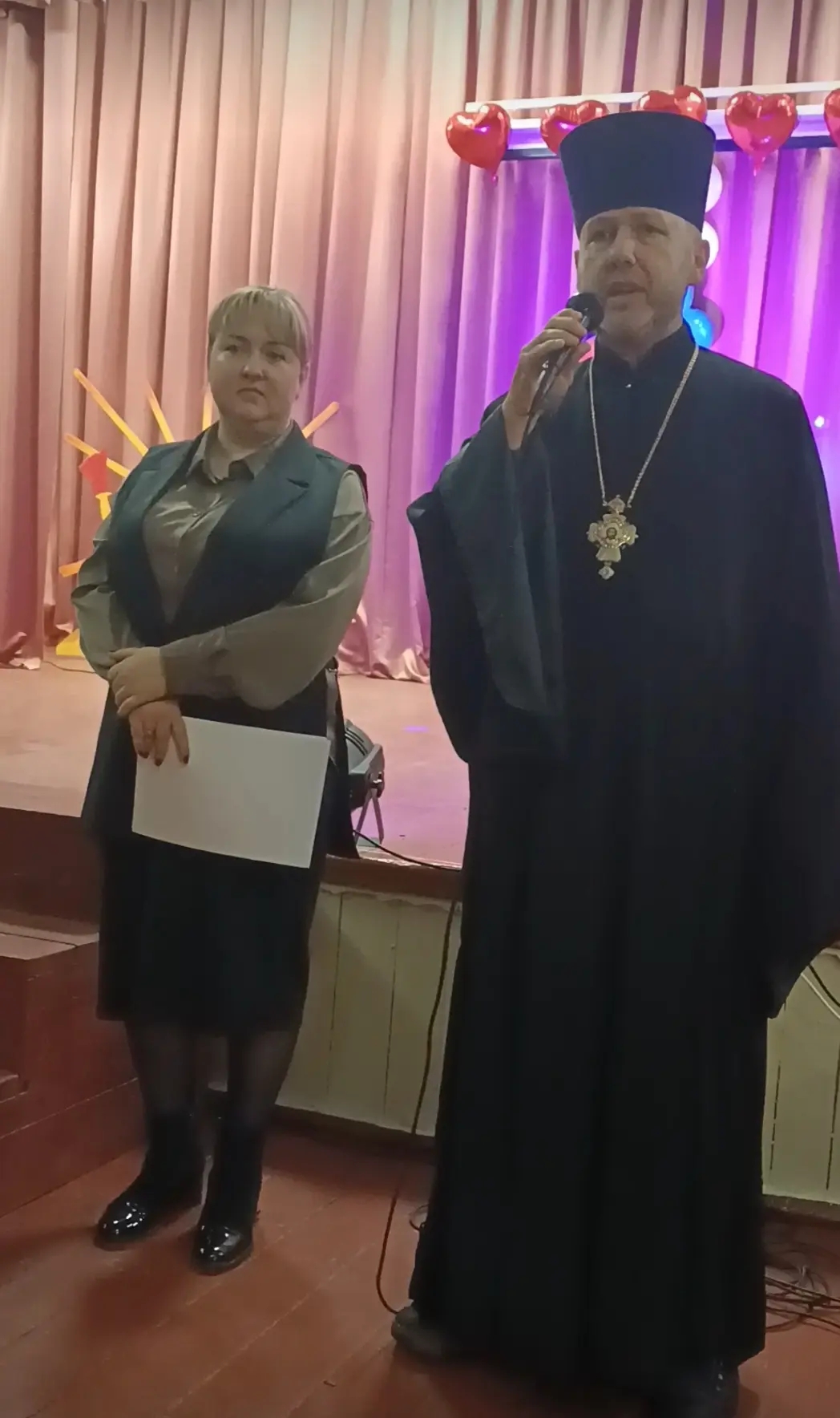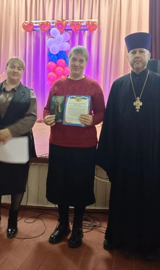 Протоиерей Роман Мясников также поздравил собравшихся, отметив, что пример героизма защитников Отечества в годы Великой Отечественной войны продолжается в подвиге нынешних героев СВО, сражающихся за свободу и традиционные духовные ценности России. Священник подчеркнул необходимость воспитания подрастающего поколения на традициях православия и примере подвига предков, в духе патриотизма и милосердия. Волонтёрам он вручил иконы Божией Матери.