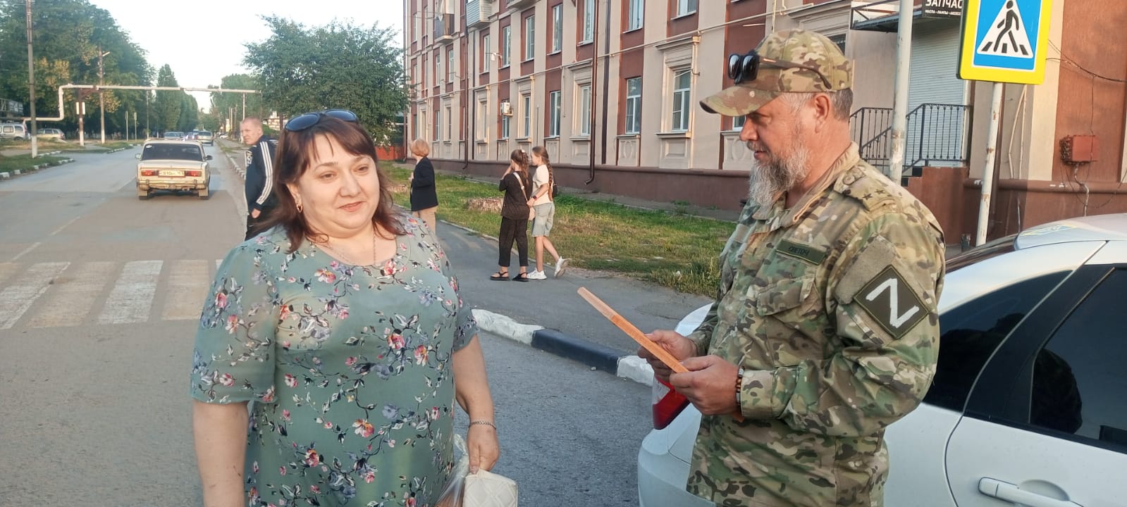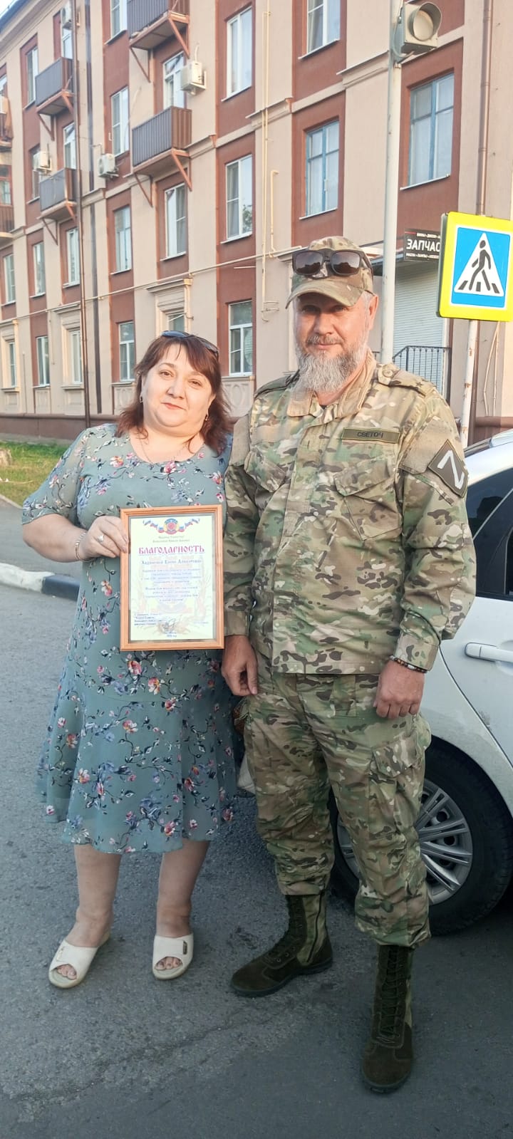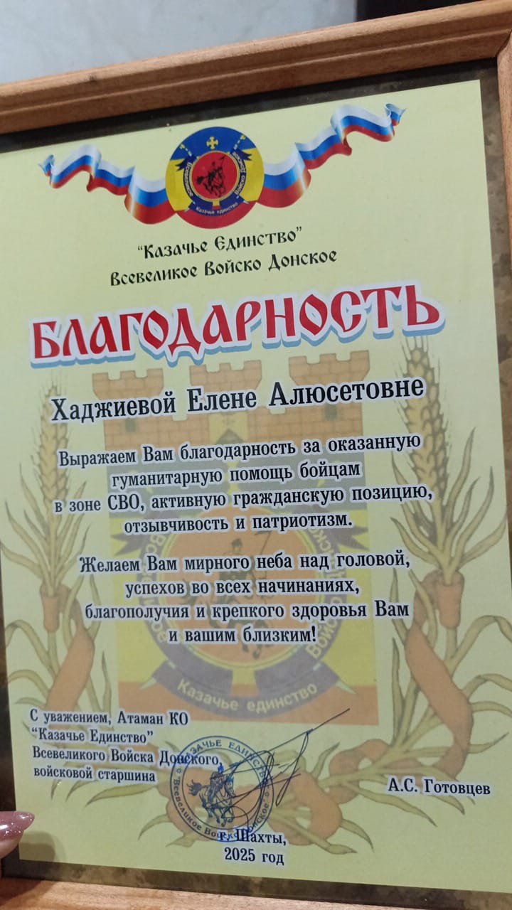 Прихожанка Пантелеимоновского храма пос. Майский Елена Хаджиева удостоена благодарности атамана КО "Казачье единство" Всеселикого Войска Донского войскового старшины А. С. Готовцева за оказанную гуманитарную помощь бойцам в зоне СВО, активную гражданскую позицию, отзывчивость и патриотизм.
