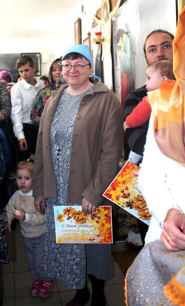 Матушка Людмила порадовала учителей огромным тортом. Ученики присоединились к поздравлениям и вручили уважаемым наставникам открытки с трогательными стихами: