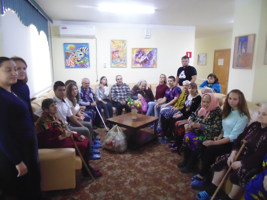 По благословению руководителя Отдела по взаимоотношениям Церкви с обществом Шахтинской епархии протоиерея Романа Амплеева пришли в гости к получателям социальных услуг в Новошахтинский дом престарелых молодые парни и девушки из школы православных добровольцев «Дельфин» города Новошахтинска. Ребята пришли в СРО со своим куратором – Саханиной И. В. и сотрудниками автотранспортного предприятия «ИП Дерюгина», которые принесли угощение для праздничного чаепития.