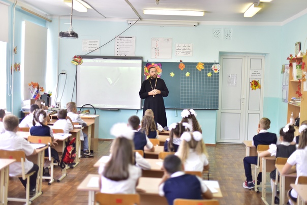 По приглашению классного руководителя 3 А класса МБОУ гимназии № 12 Татьяны Петровны Санжаровой, настоятель храма Всех святых, в земле Русской просиявших, г. Каменск-Шахтинский протоиерей Виталий Крейдич принял участие в уроке на тему «Россия – Родина моя».