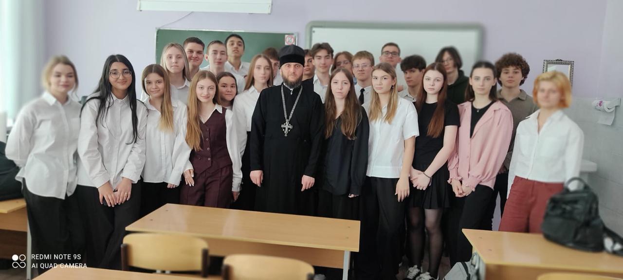 Урок был посвящен поиску смысла жизни и значению каждого совершаемого нами поступка. Отец Герман рассказал учащимся о роли Церкви в жизни каждого человека, о значении богослужений и таинств. Ответил на интересовавшие вопросы слушающих.
