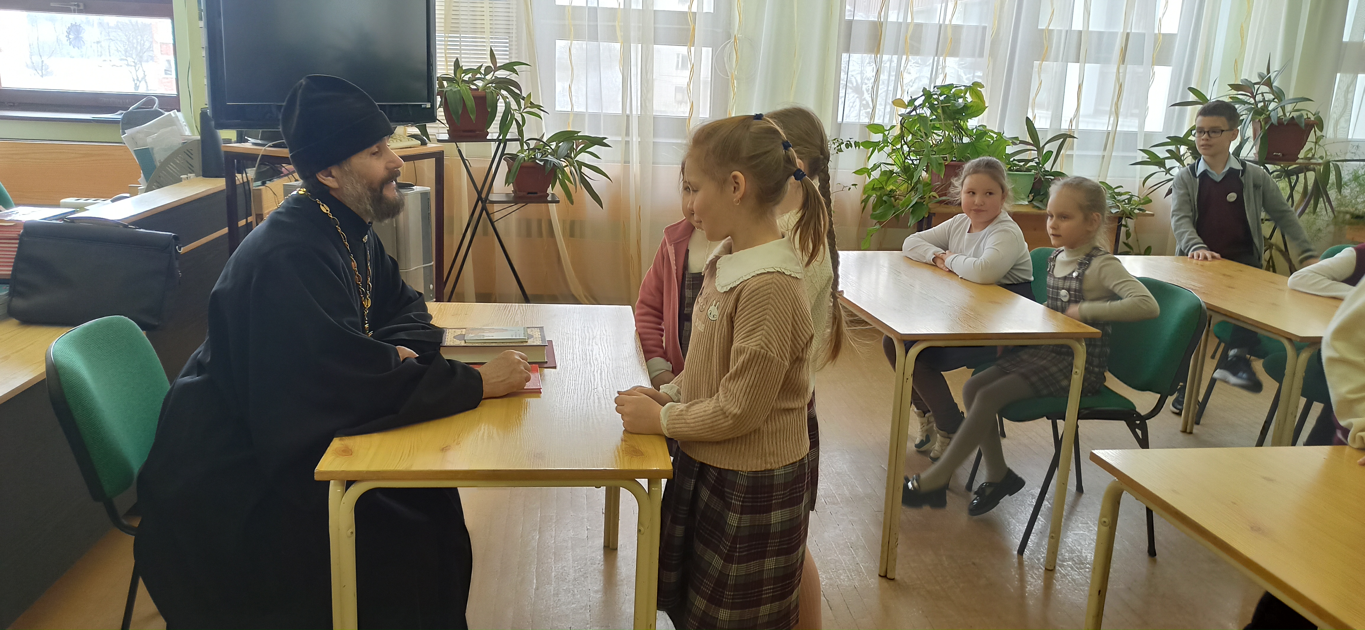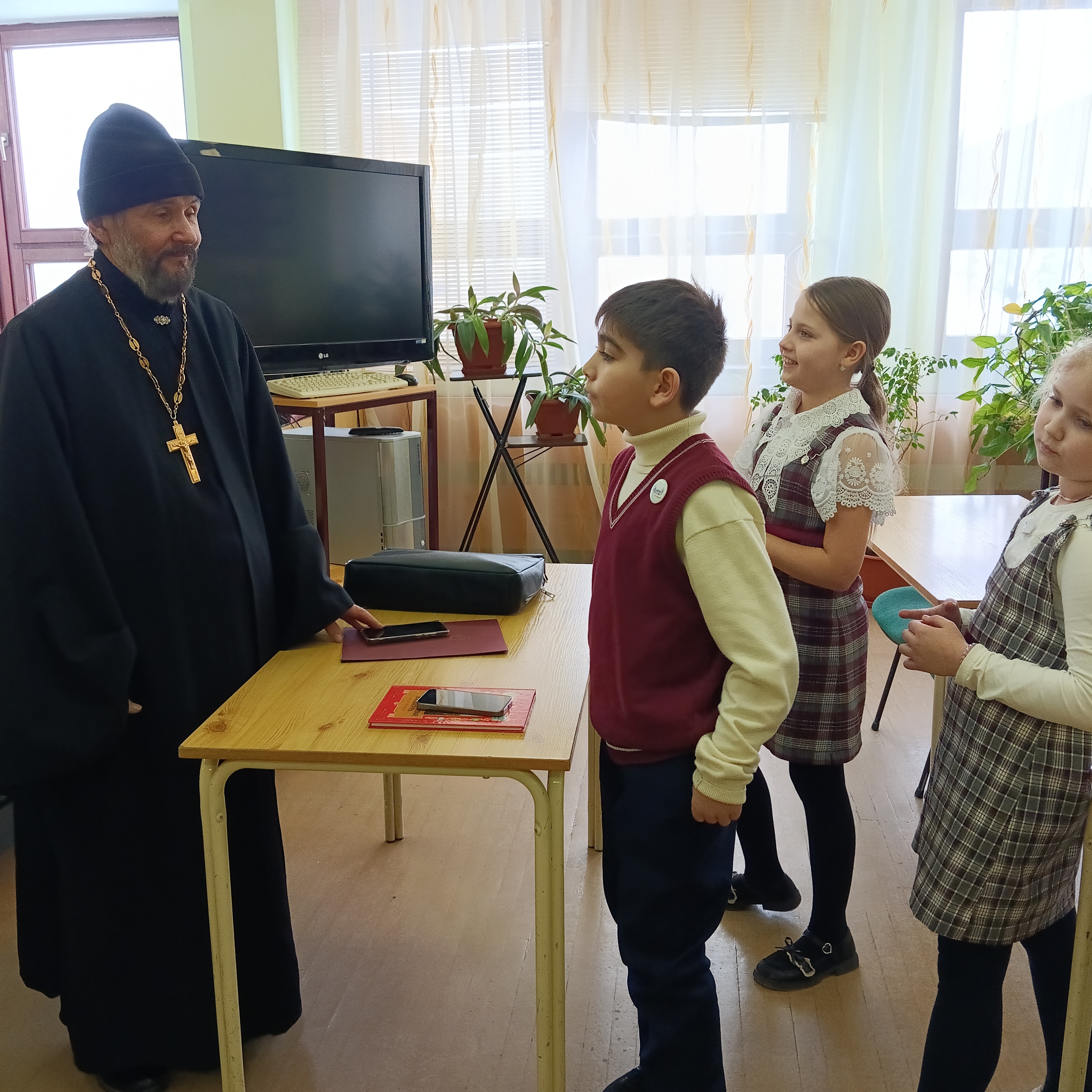 Атмосфера встречи оказалась настолько увлекательной, что ребята не хотели расходиться и продолжали общаться с батюшкой всю перемену, вплоть до начала следующего урока. В завершение дети сердечно поблагодарили священника за познавательную и душевную беседу.