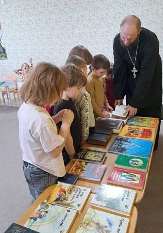 Священник рассказал детям о том, что печатные книги были не всегда, и что много веков назад мастер Иван Фёдоров напечатал первые книги, среди которых была и первая Азбука. Затем отец Андрей прочитал ребятам интересный рассказ, и все вместе рассмотрели книги, представленные на выставке.