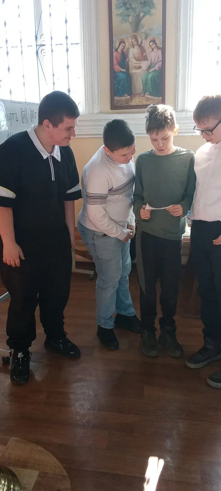 Затем состоялось громкое чтение с обсуждением рассказа В.А. Никифорова-Волгина «Исповедь». В главном герое рассказа, их сверстнике, многие узнали себя. В центре внимания ребят была игра «Древо-мудрости». В небольшое искусственное дерево были вложены скатанные трубочкой вопросы, с зеленой полоской – младшим, с красной – старшим. Ребята активно включились в проверку своих знаний по Священному Писанию и церковно-славянскому языку.
