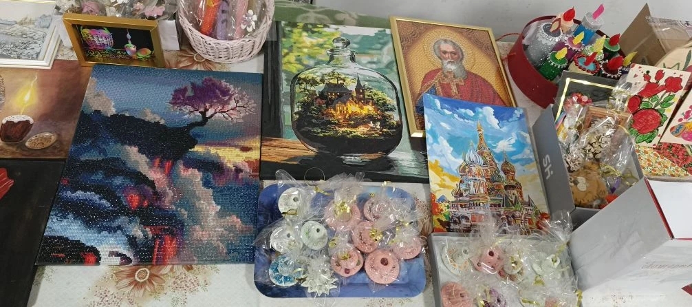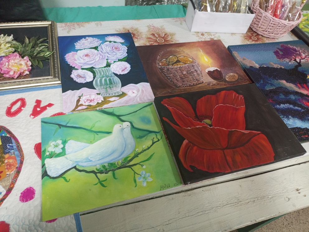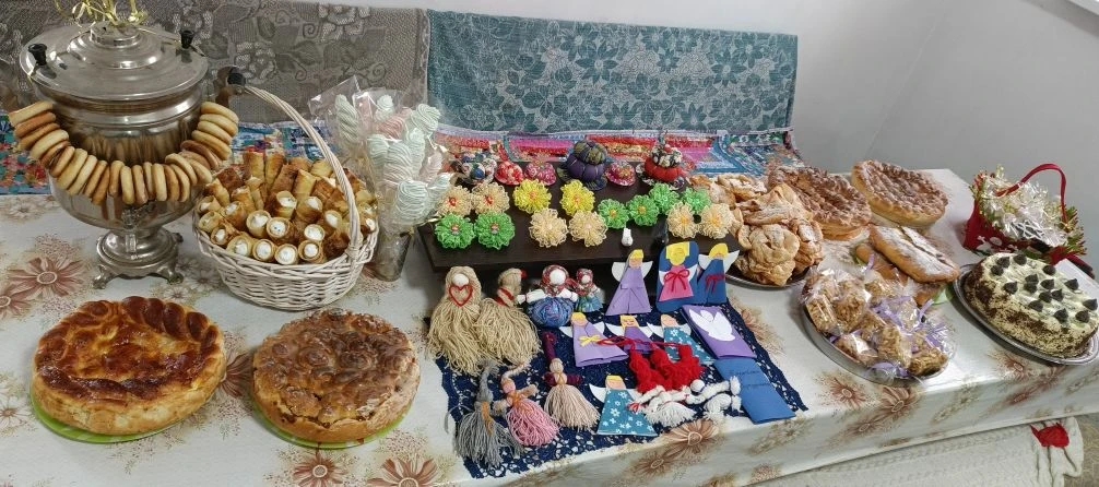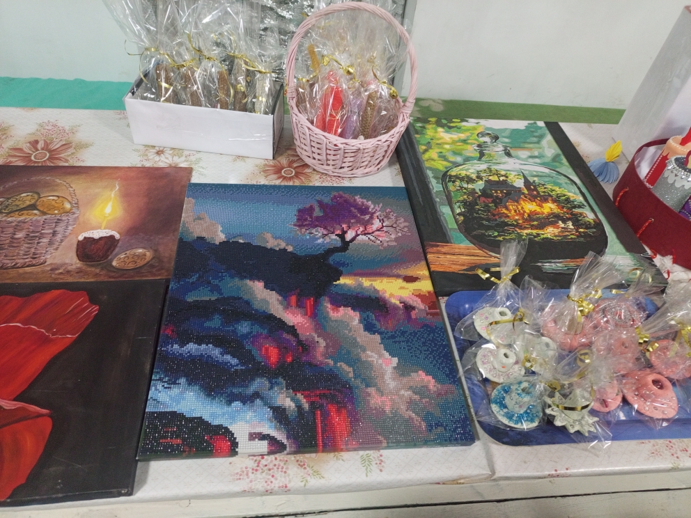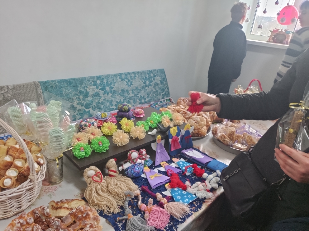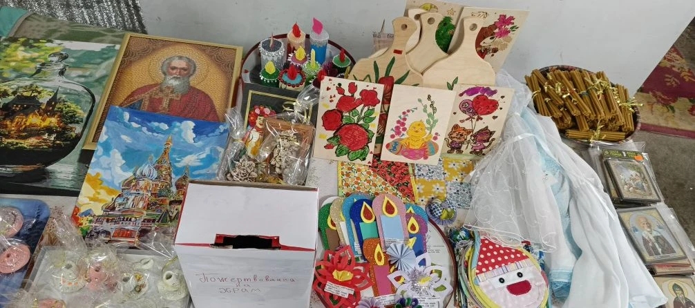 Затем на территории храма развернулась оживлённая благотворительная ярмарка, где прихожане и гости смогли не только приобрести уникальные товары, но и внести свою лепту в общее дело. На прилавках было представлено всё, что создавалось добрыми и искусными руками воспитанников воскресной школы, их родителей и прихожан: домашняя выпечка и сладости, вязаные носки, игрушки, картины, открытки, прихватки, игольницы, бантики, свечи из вощины и фоамирана, изделия из солёного теста и другие приятные мелочи.