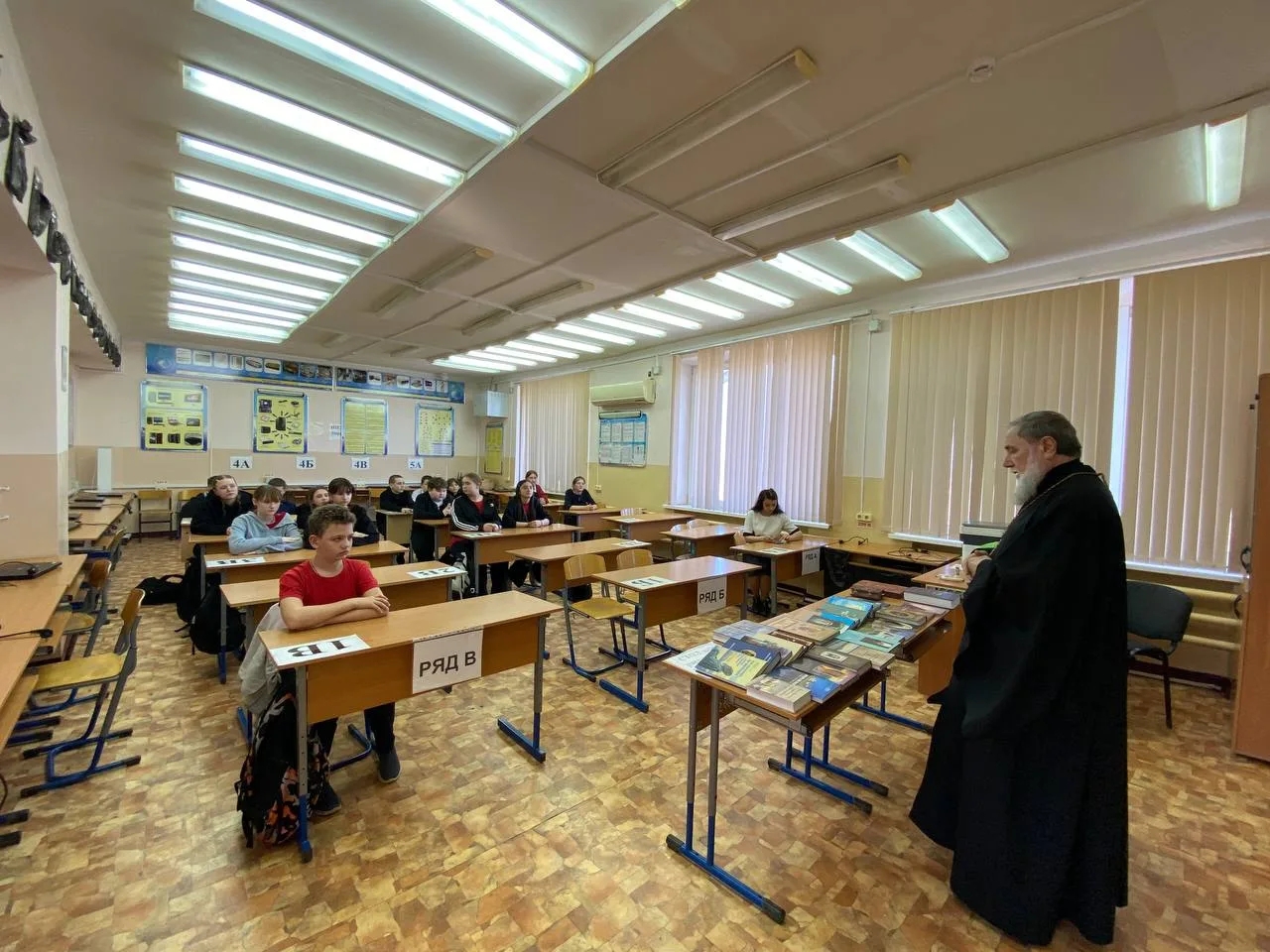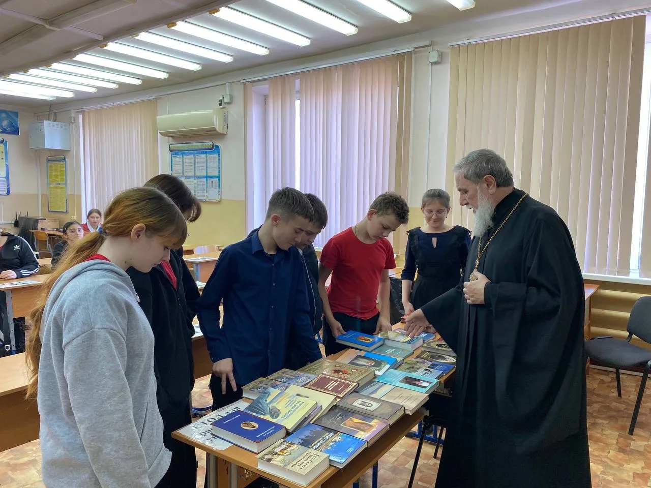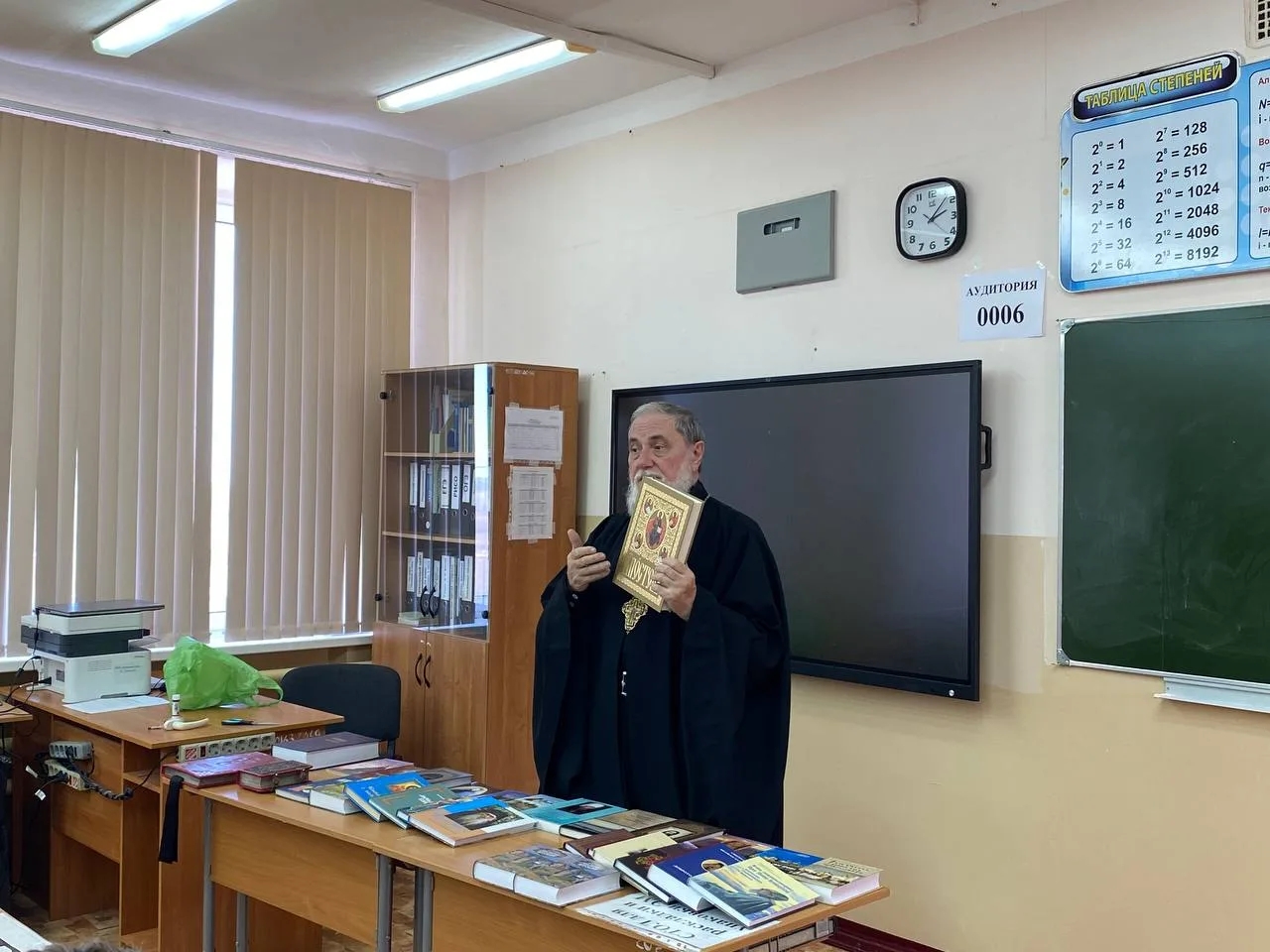 В конце встречи отец Владимир передал в школьную библиотеку 20 книг из выставочной коллекции.