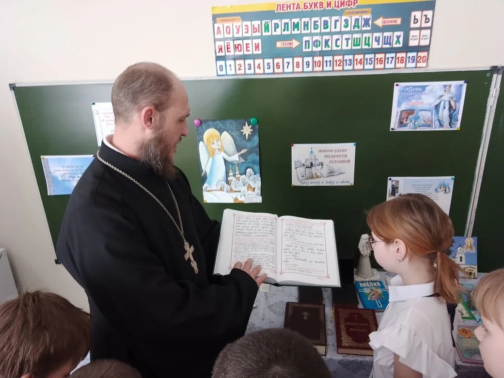 В ходе беседы иерей Андрей дал детям возможность увидеть и полистать богослужебные книги: Апостол, Святое Евангелие, Псалтирь. Священник рассказал о Библии, ее составе и значении Слова Божия для человеческой цивилизации и каждого человека.