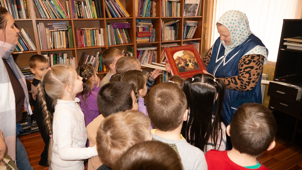 Особый интерес у детей вызвало редкое подарочное издание книги Виктора Аксючица «Миссия России», в которой рассматривается судьба русского народа как единого национально-государственного организма, сформированного Православием.