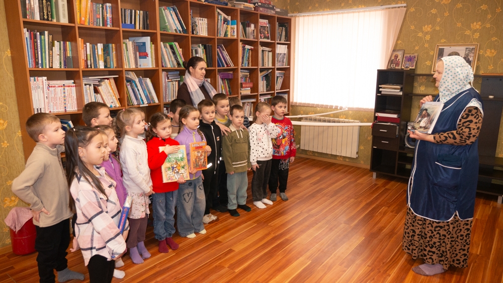 4 марта 2026 года воспитанники старшей и подготовительной группы «Казачок» посетили Пятницкое архиерейское подворье станицы Манычской. По благословению благочинного Багаевского округа протоиерея Александра Маликова инокиня Параскева познакомила ребят с библиотекой, составленной из книг, подаренных прихожанами храма святой великомученицы Параскевы Пятницы.