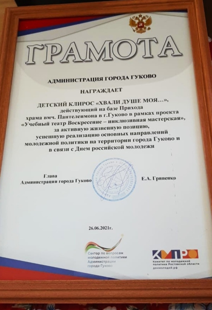 Коллектив детского клироса: «Хвали, душе моя...» при храме великомученика и целителя Пантелеимона г. Гуково награжден грамотой Администрации г. Гуково за активную жизненную позицию