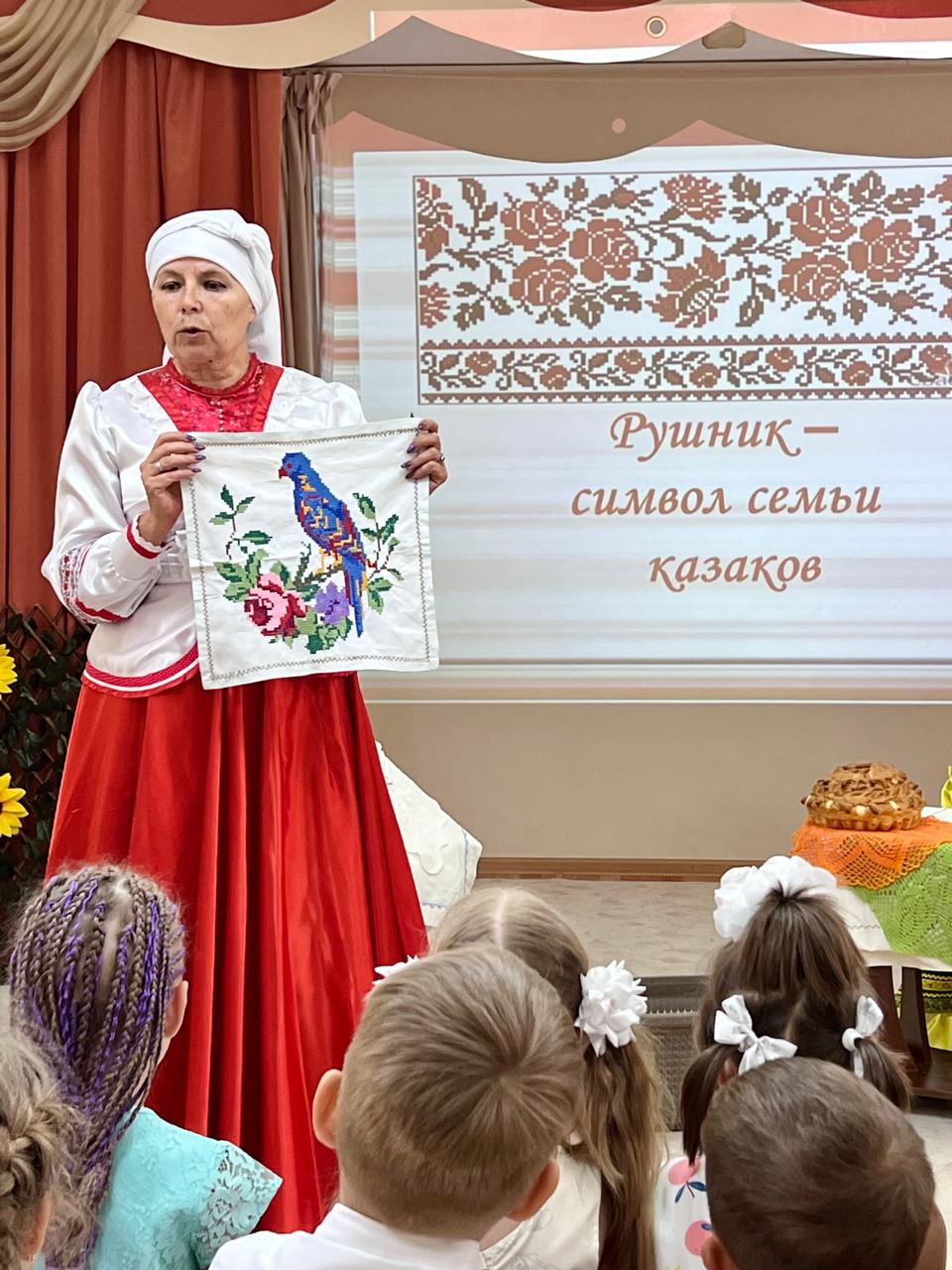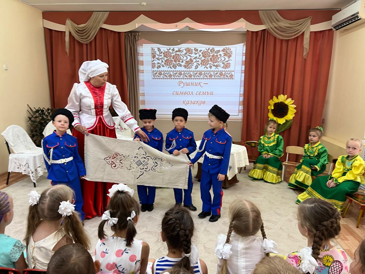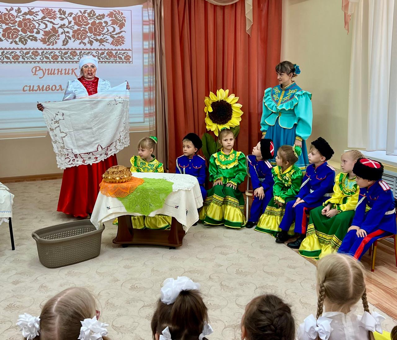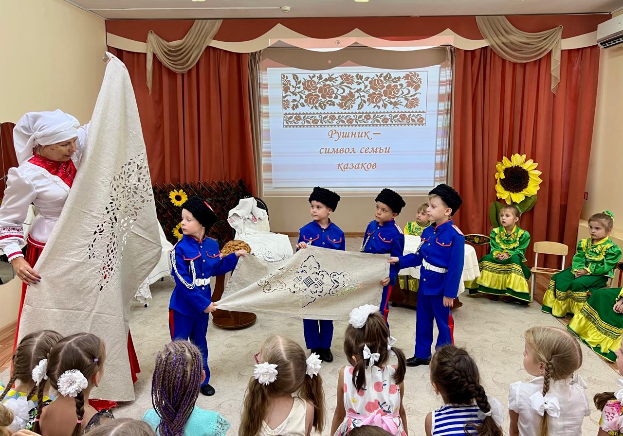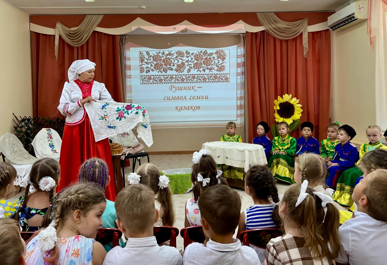 В детском саду продолжается знакомство детей с традиционной народной культурой и бытом казаков. У старших воспитанников состоялась очередная интересная и познавательная встреча с Саханиной Инной Викторовной – сестрой милосердия, куратором гуманитарного центра «От Сердца к сердцу» Донского храма г. Новошахтинска. Инна Викторовна подготовила детям удивительный «Сказ о рушнике». Дети узнали о быте, православных традициях и культуре казаков Дона, познакомились с одним из видов народно-прикладного искусства донских казаков: вышивкой. Рассматривая рушники (полотенца), дети узнали об их истории, какую роль они играют в жизни казачьей семьи, какие цвета использовали мастерицы, чтобы вышить рушник, что означала вышивка, что такое приданое и с какого возраста, юные казачки занимались его изготовлением.