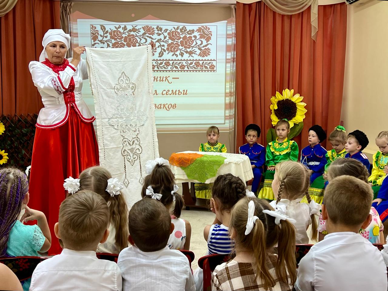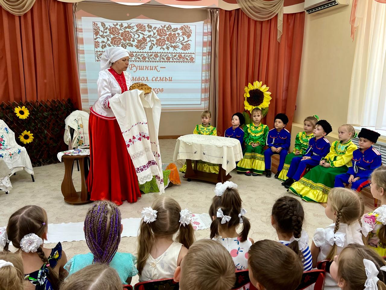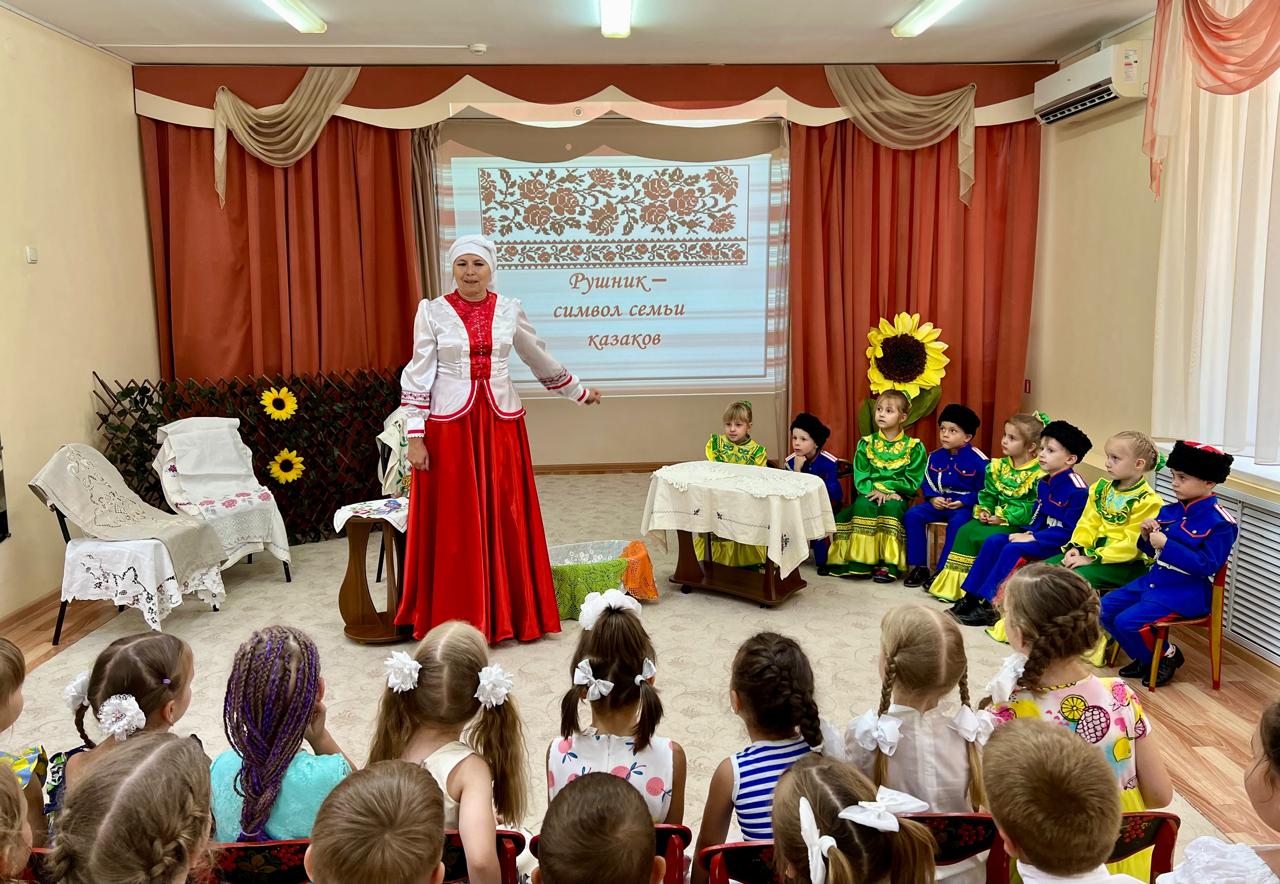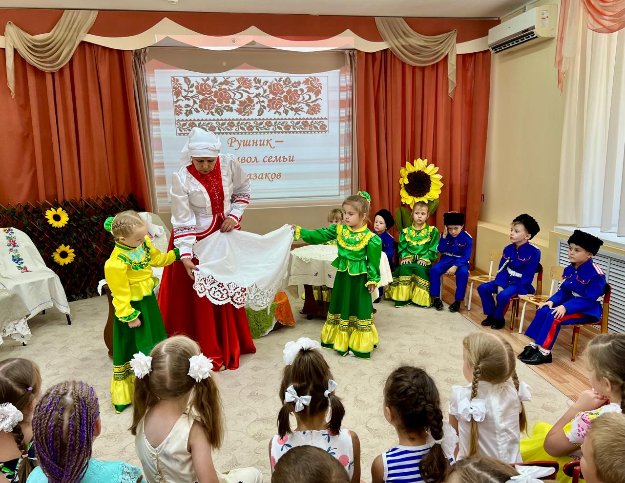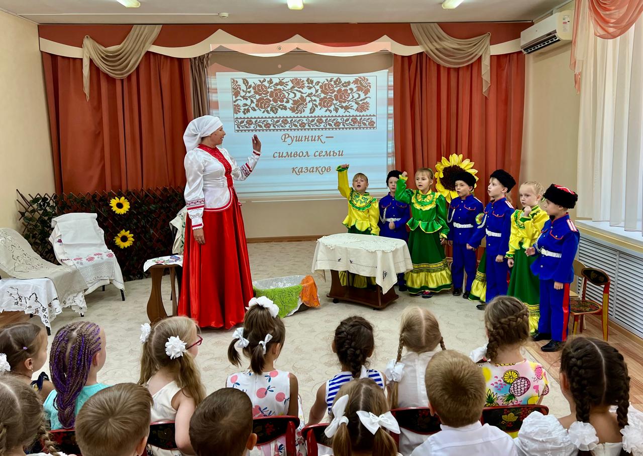 В детском саду продолжается знакомство детей с традиционной народной культурой и бытом казаков. У старших воспитанников состоялась очередная интересная и познавательная встреча с Саханиной Инной Викторовной – сестрой милосердия, куратором гуманитарного центра «От Сердца к сердцу» Донского храма г. Новошахтинска. Инна Викторовна подготовила детям удивительный «Сказ о рушнике». Дети узнали о быте, православных традициях и культуре казаков Дона, познакомились с одним из видов народно-прикладного искусства донских казаков: вышивкой. Рассматривая рушники (полотенца), дети узнали об их истории, какую роль они играют в жизни казачьей семьи, какие цвета использовали мастерицы, чтобы вышить рушник, что означала вышивка, что такое приданое и с какого возраста, юные казачки занимались его изготовлением.