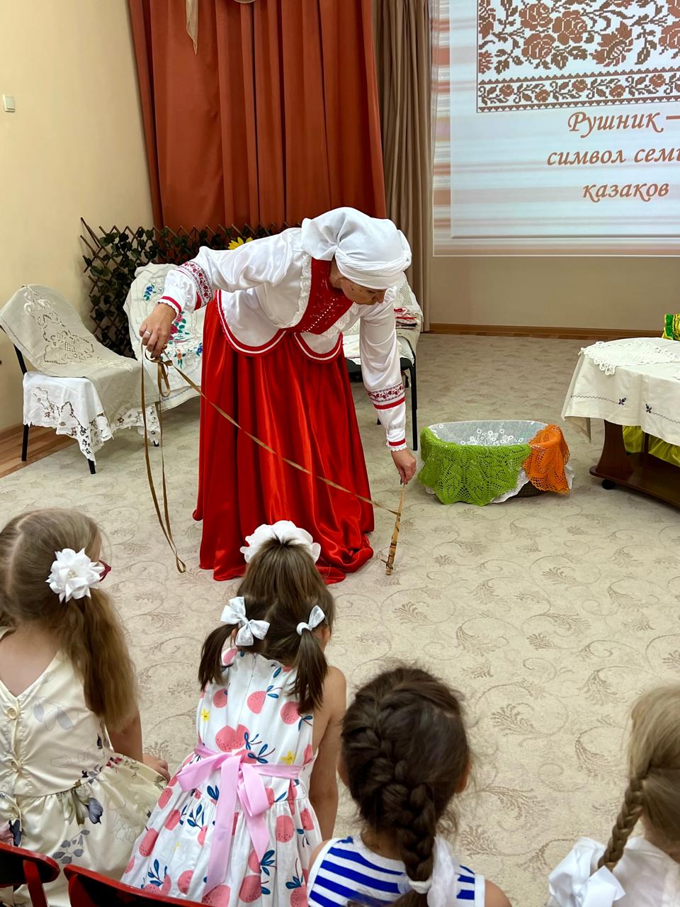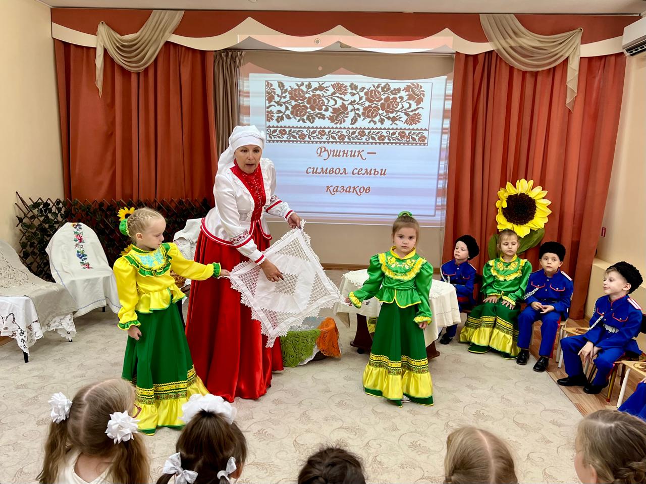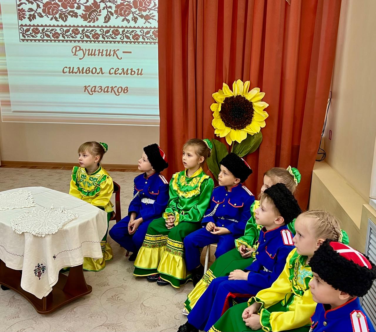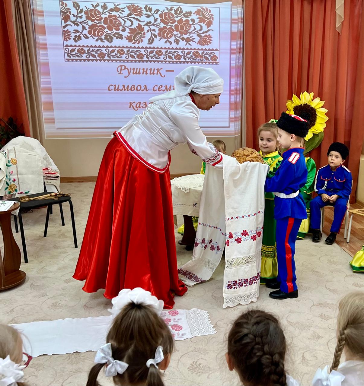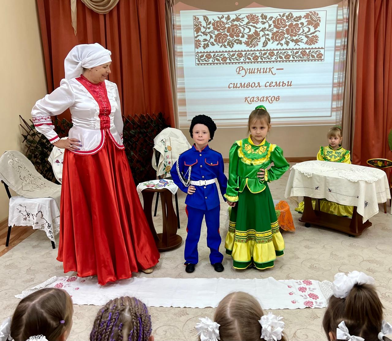 В детском саду продолжается знакомство детей с традиционной народной культурой и бытом казаков. У старших воспитанников состоялась очередная интересная и познавательная встреча с Саханиной Инной Викторовной – сестрой милосердия, куратором гуманитарного центра «От Сердца к сердцу» Донского храма г. Новошахтинска. Инна Викторовна подготовила детям удивительный «Сказ о рушнике». Дети узнали о быте, православных традициях и культуре казаков Дона, познакомились с одним из видов народно-прикладного искусства донских казаков: вышивкой. Рассматривая рушники (полотенца), дети узнали об их истории, какую роль они играют в жизни казачьей семьи, какие цвета использовали мастерицы, чтобы вышить рушник, что означала вышивка, что такое приданое и с какого возраста, юные казачки занимались его изготовлением.