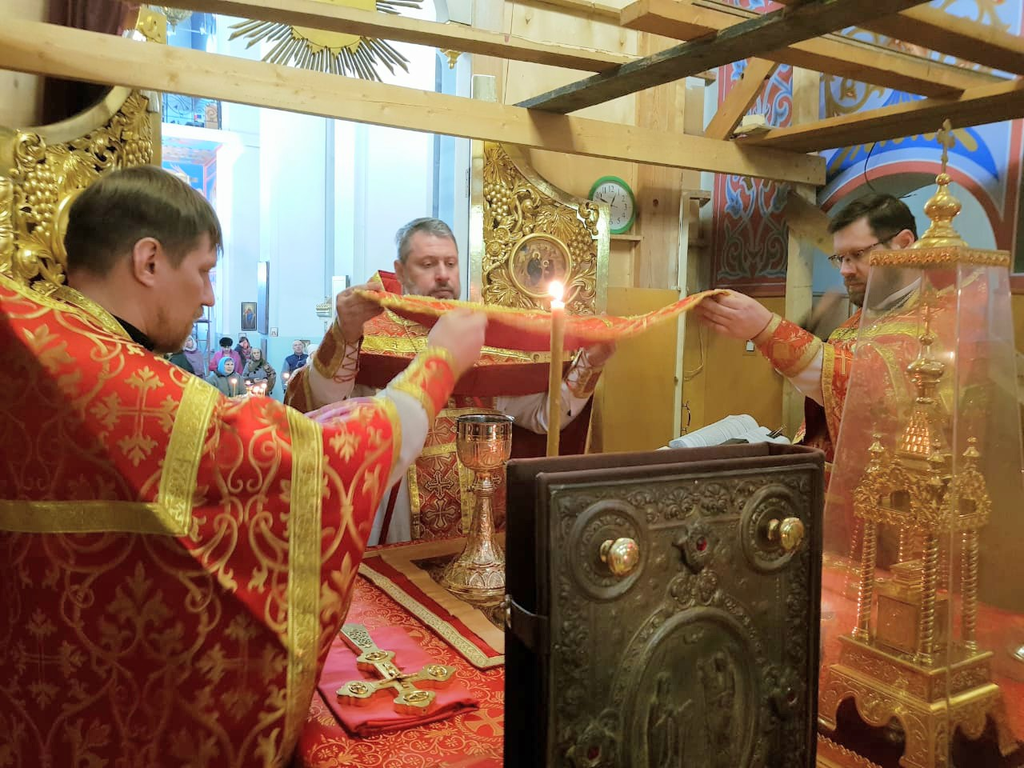 В полночь в Покровском храме состоялась Божественная литургия, которую совершили настоятель Покровского храма иерей Владислав Касьянов и клирики храма иерей Владимир Щербаков и иерей Александр Шляхетский.